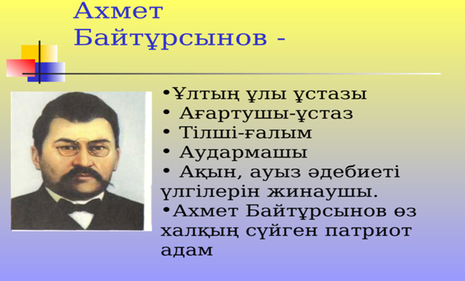 Қазақ халқының тағдыры мен тілі үшін күрескен Алаш арысы, ұлт ұстазы Ахмет Байтұрсынұлының туған күні. Қазақ әліпбиінің негізін салған ғалымның туған күнінде мектебімізде "Тіл-тірегіміз, соғып тұрған жүрегіміз" атты тақырыбында сынып сағаты болып өтті.