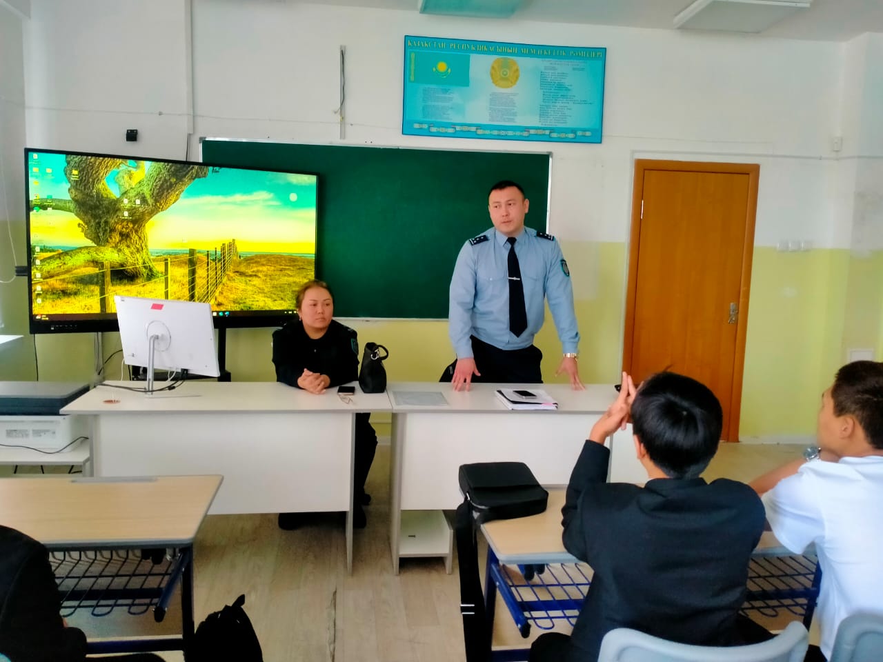 20.11.2024ж. Медеу ауданы ЖПҚБ ЮПБ полиция капитаны Нұрсұлтан Аманович Несипбаев, мектеп инспекторы полиция майоры Ж.Ж.Тулепова мен 8,9,10,11 сынып оқушылары арасында кездесу болып өтті. Кездесу барысында, құқық бұзушылықтың алдын алу, қоғамдық орында өзін қалай ұстау керек және қылмыстың құрбаны болмау үшін кәмелетке толмағандардың құқықтары мен міндеттері туралы айтып, түсіндірді.
