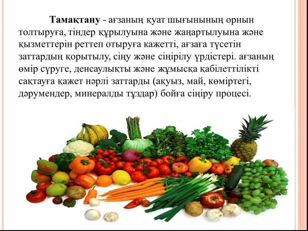 Адамзат денсаулығын сақтаудың басты шарты – дұрыс тамақтану. Сондықтан тамақтануға ерекше көңіл бөлген жөн. Тамақ құрамының құндылығы басты назарда болғаны дұрыс. Тиімді, дұрыс тамақтану денсаулықты сақтауға, ағзаның қалыпты өсуі мен дамуына, жұмыс қабілетінің жоғарылауына және ағзаның қоршаған ортаның әртүрлі жағымсыз әсеріне қарсылығын күшейтуге ықпалын тигізеді.