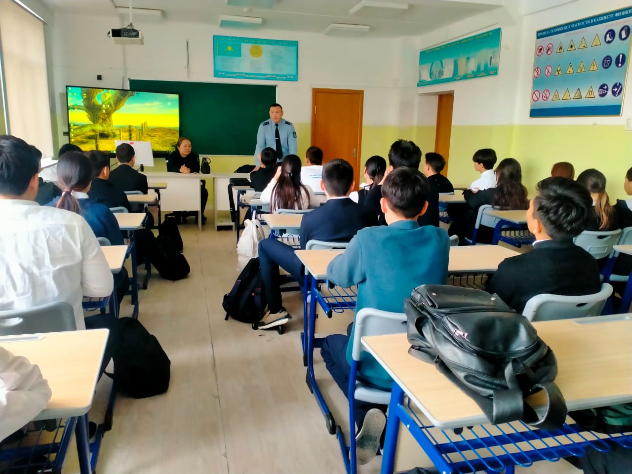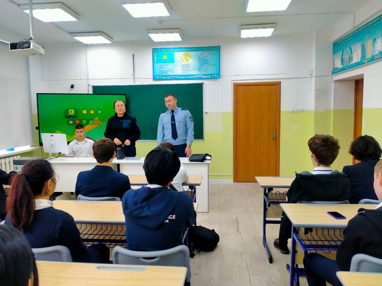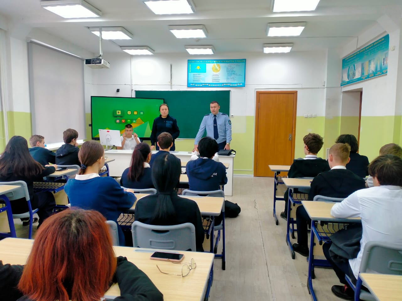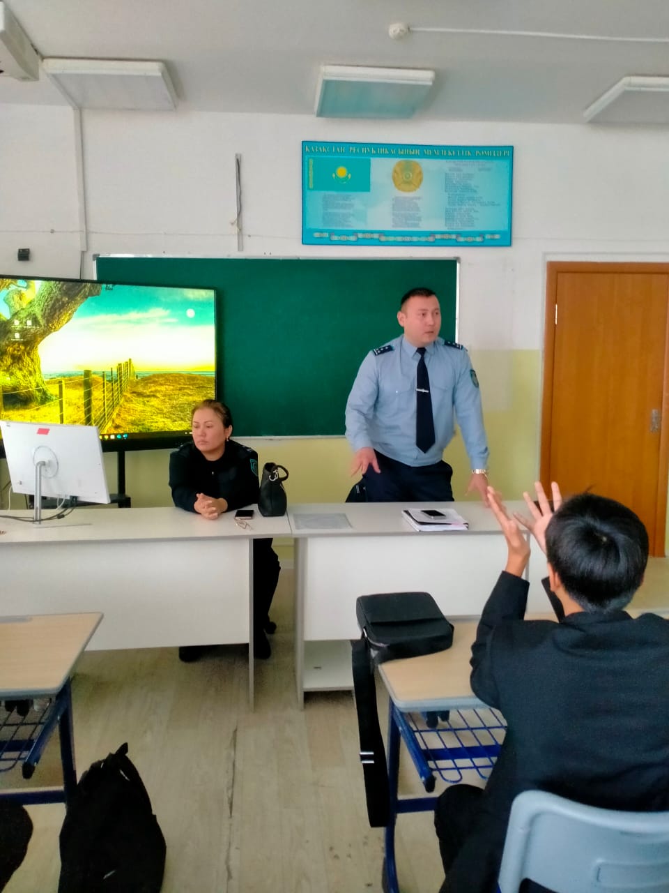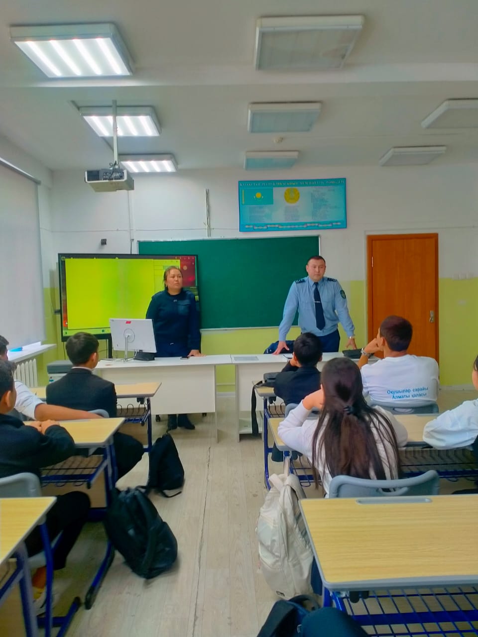 20.11.2024ж. Медеу ауданы ЖПҚБ ЮПБ полиция капитаны Нұрсұлтан Аманович Несипбаев, мектеп инспекторы полиция майоры Ж.Ж.Тулепова мен 8,9,10,11 сынып оқушылары арасында кездесу болып өтті. Кездесу барысында, құқық бұзушылықтың алдын алу, қоғамдық орында өзін қалай ұстау керек және қылмыстың құрбаны болмау үшін кәмелетке толмағандардың құқықтары мен міндеттері туралы айтып, түсіндірді.