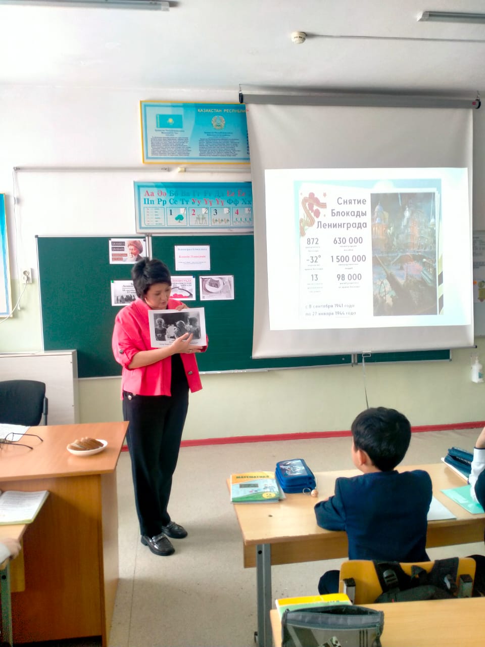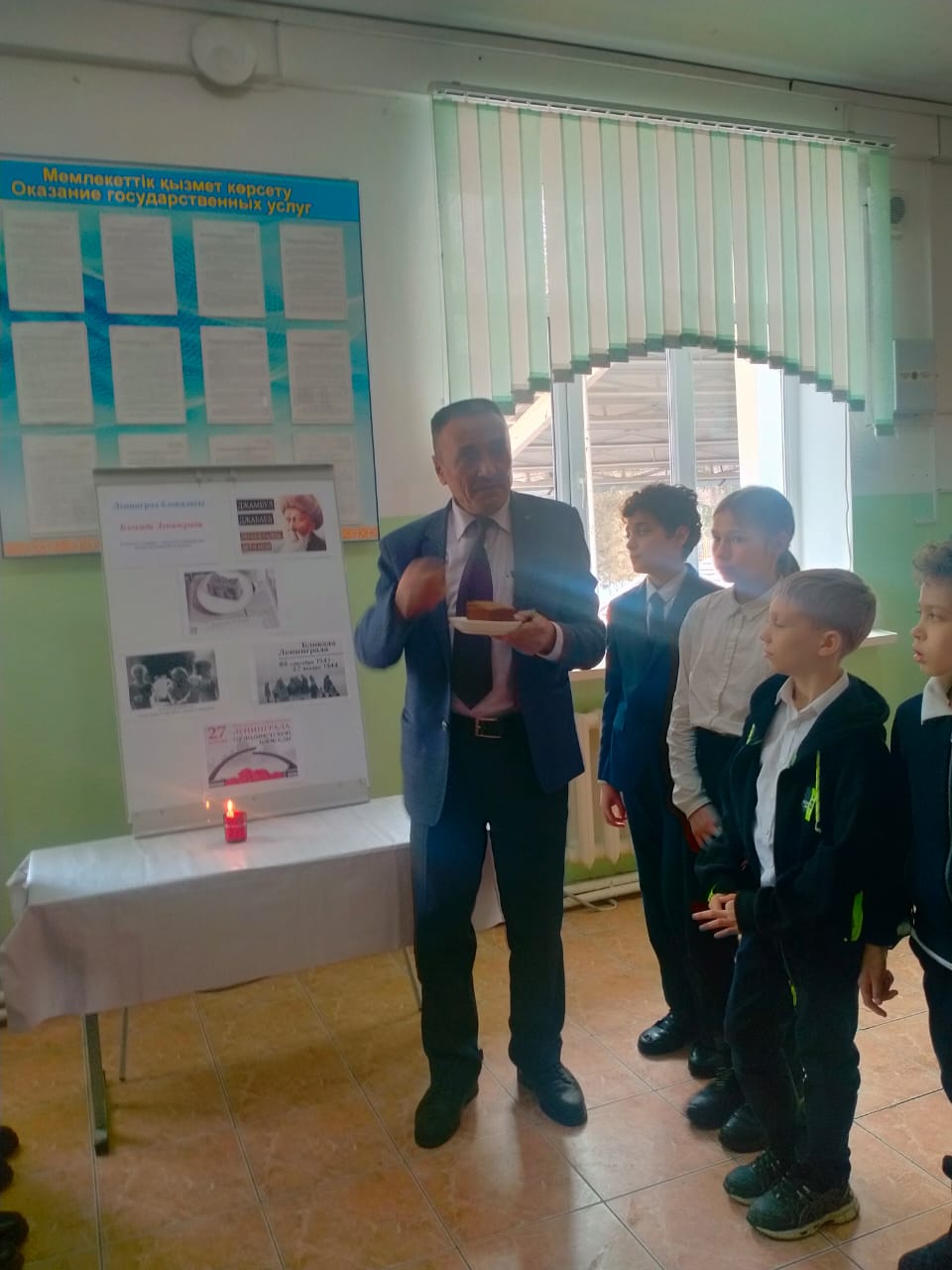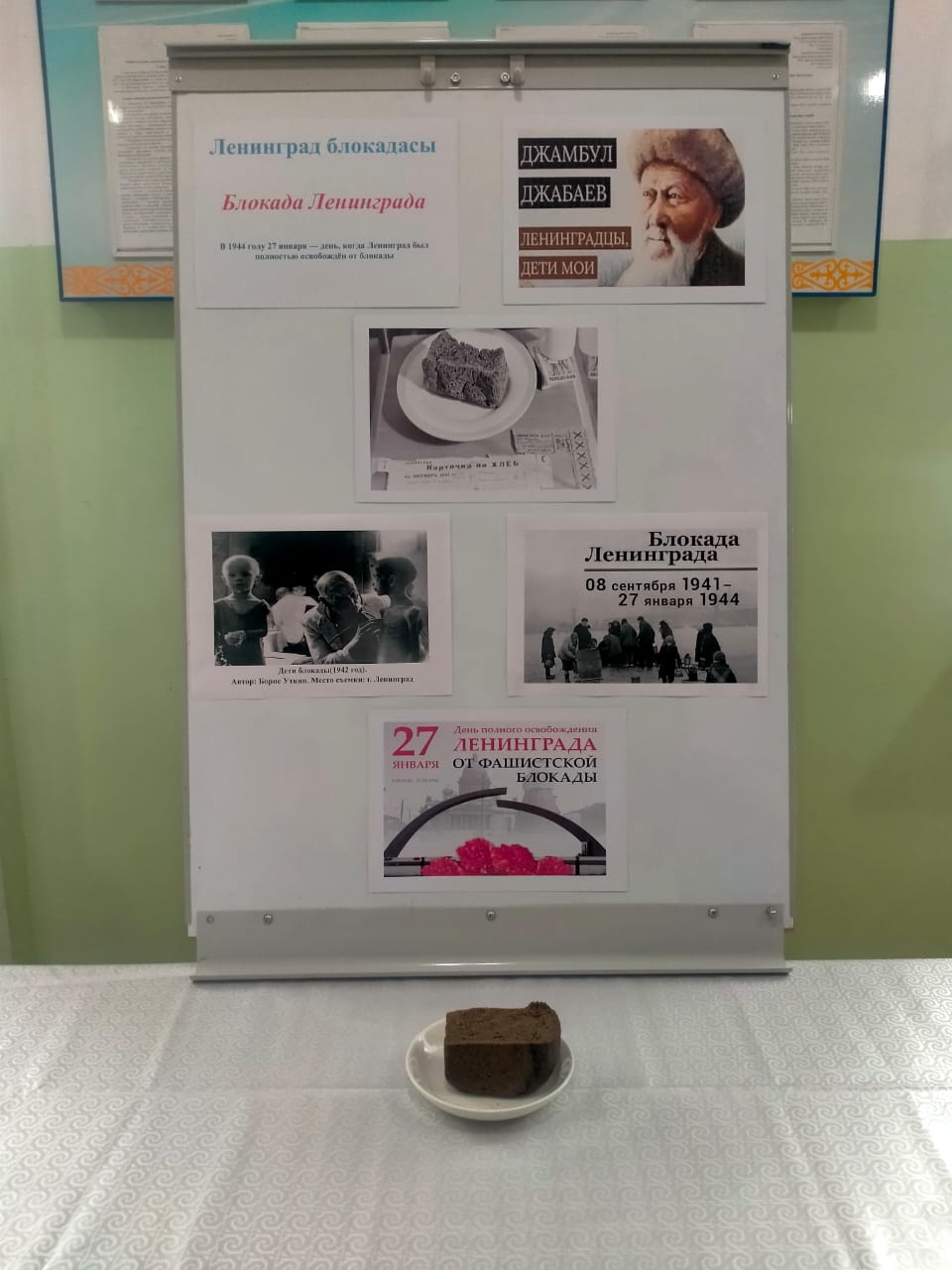 27.01.2025ж. "Ешкім де, ештеңе де ұмытылмайды" деген қағиданы ұстана отырып, жас ұрпаққа тарихымызды тереңінен ұғындыру мақсатында 900 күнге созылған Ленинград блокадасы, 900 күнге созылған аштық жайында оқушыларға түсіндірмелі жұмыстар жүргізілді. Ленинград блокадасы 1941 жылы 8 қыркүйекте басталып, 1944 жылы 27 қаңтарда Ленинград блокададан азат етілді. Осы тарихи кезеңге Ж.Жабаев "Ленинградтық өренім" атты өлеңін арнады.