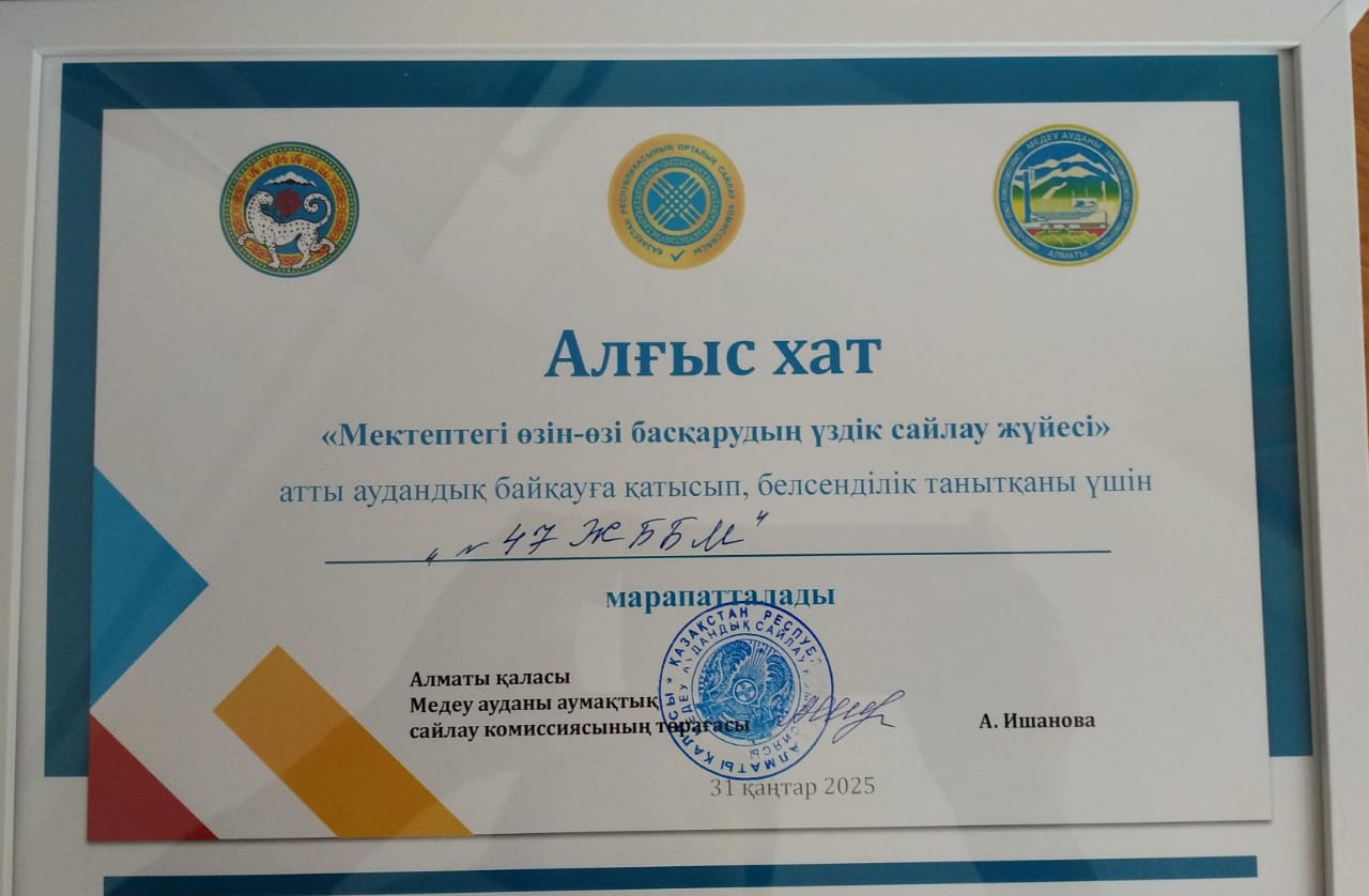 Медеу ауданы №48 мектеп - лицейінде өткен, Дүниежүзілік сайлау күні қарсаңында өткізілетін "Мектептегі өзін-өзі басқарудың үздік сайлау жүйесі" атты аудандық байқауына мектебіміздің өзін-өзі басқару ұйымы қатысып, Алғыс хатпен марапатталды.
