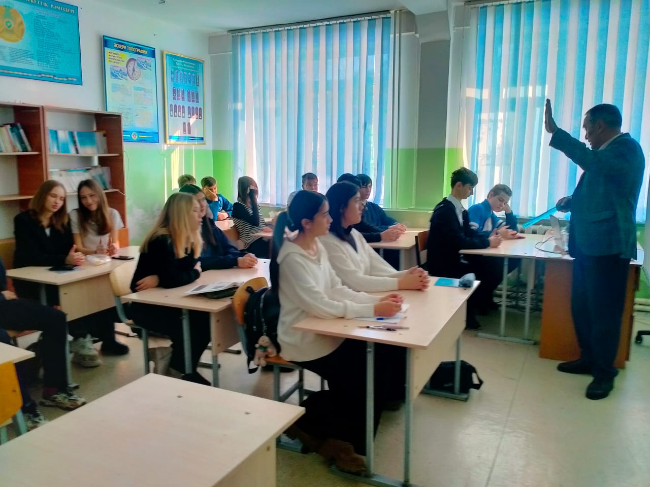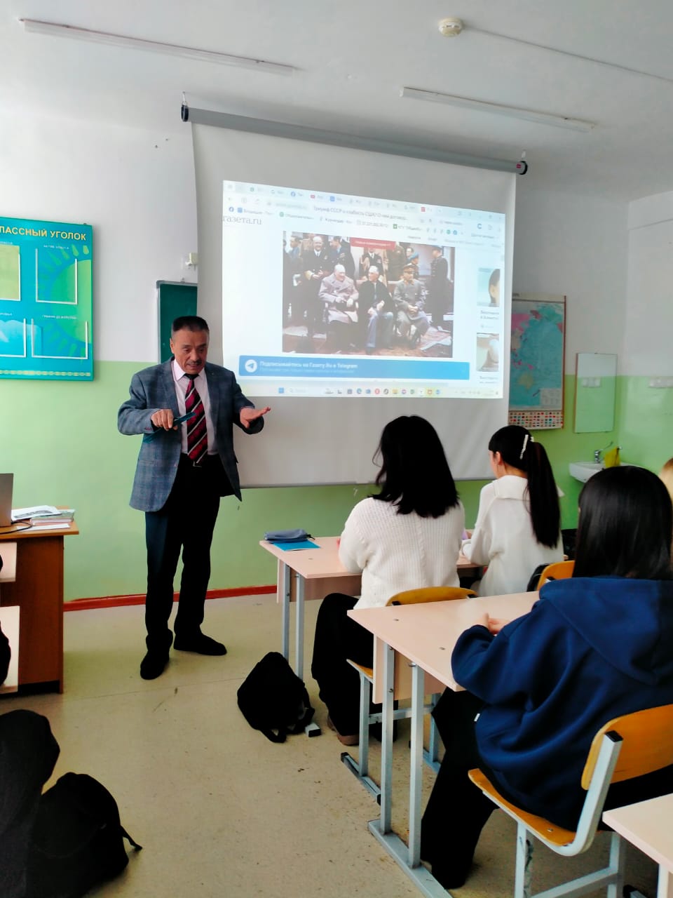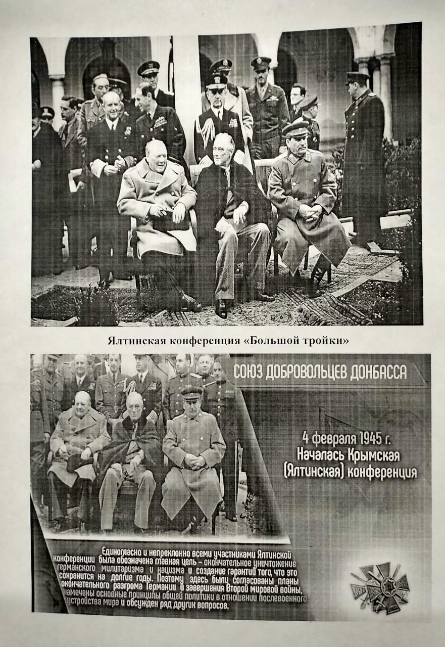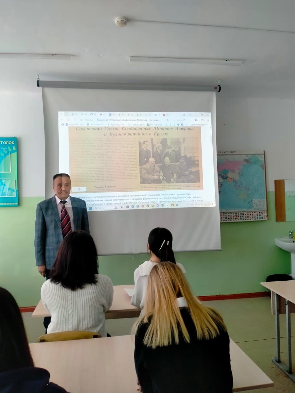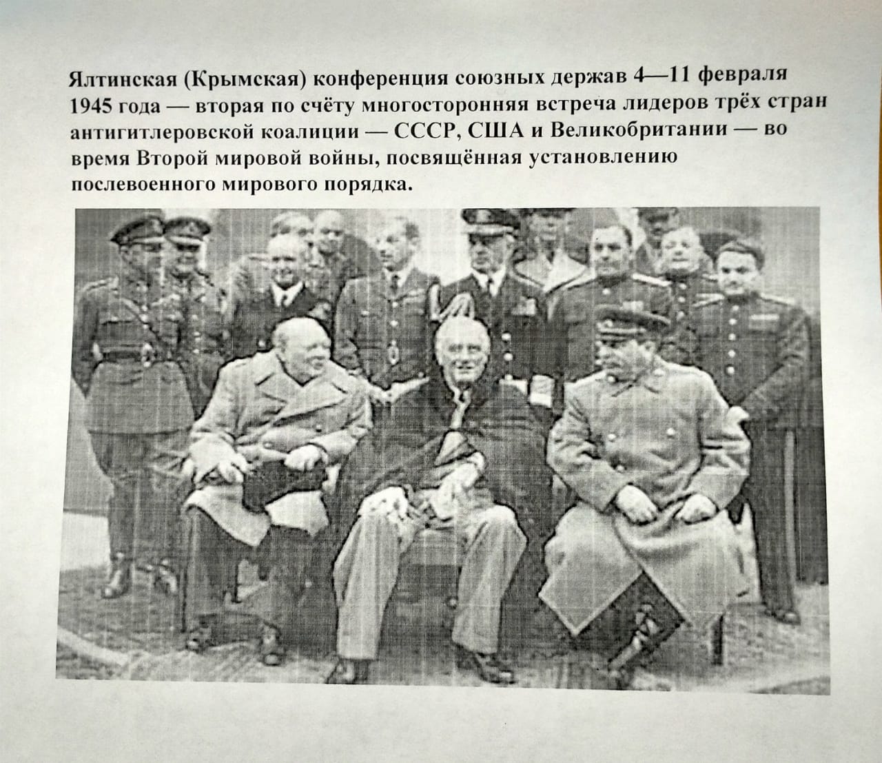 04.02.1945ж. Ялта конференциясы немесе Қырым конференциясы-Қырымдағы Ялта қаласында өткен халықаралық келісім. Ұлы Отан Екінші дүниежүзілік соғыстағы одақтас үш ірі мемлекеттер - Ұлыбритания, АҚШ және КСРО-ның мемлекет басшылары: Уинстон Черчилль, Франклин Рузвельт, Иосиф Сталин, сыртқы істер министрлері, штаб бастықтары және т.б. кеңесшілері қатысқаны жайлы тарих пәнінің мұғалімі С..С. Сулеев оқушыларға баяндады.