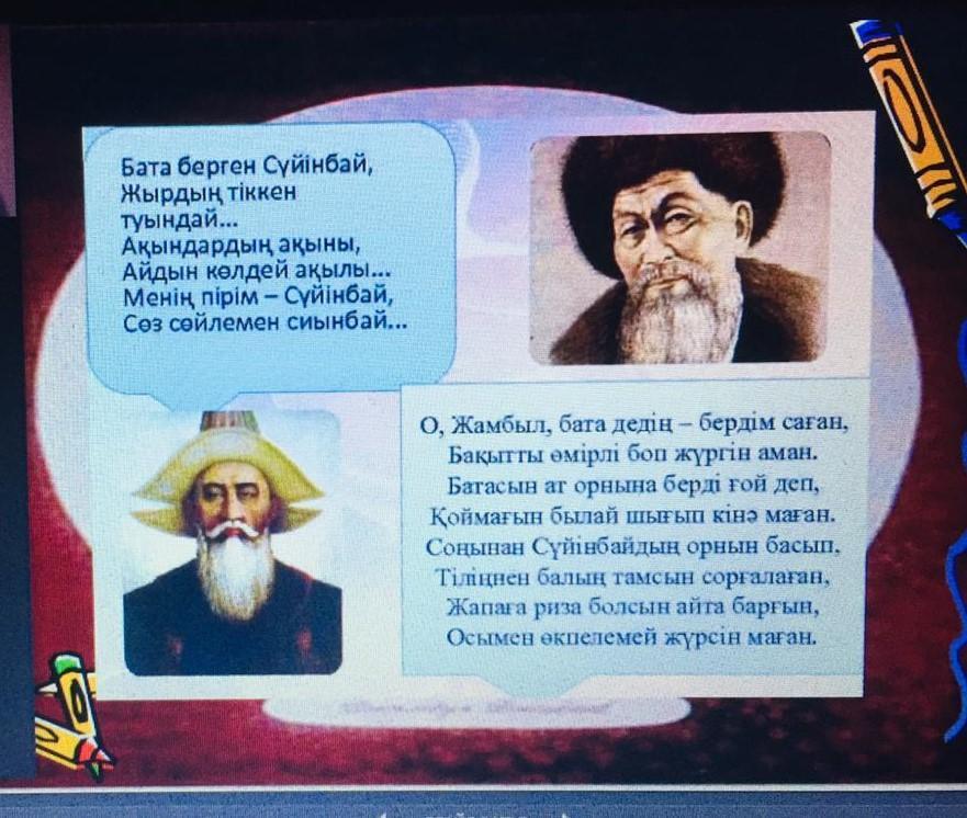 22 қыркүйек тілдер күніне орай, Жыр алыбы Жамбылдың ақындық талантын шәкірт жүрегіне ұялату мақсатында 7 «Ә» сынып оқушылары, ақынның өлеңдерін оқып, өзара ой бөлісті. Мақсаты: оқушылардың сөйлеу мәдениетін дамыту, сөз өнерін қадірлеп, қастерлей білуге дағдыландыру, ақын өлеңдерін, поэзиясын бағалай білуге ұғындыру,үйрету.