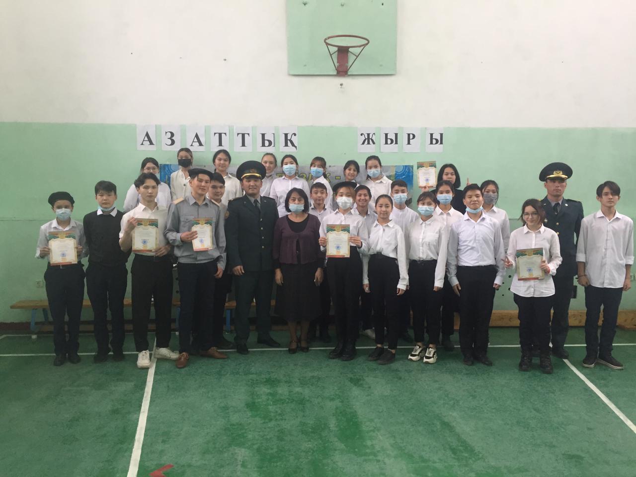 Қазақстан Республикасы Тәуелсіздігінің 30 жылдығына орай "АЗАТТЫҚ ЖЫРЫ" атты тақырыпта, Алғашқы әскери дайындық пәнінің мұғалімі Н.Т.Жұмаділовтің ұйымдастыруымен 7,8,9,10,11- сынып оқушылары арасында саптық ән байқауы болып өтті.