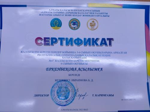 10 январь 2023 0 1 2 3 4 5 СЕРТИФИКАТ Республикалық олимпиаданың қалалық кезеңіне қатысқаны үшін 6 "Ә" сынып оқушысы Еркенбекова Асылымға берілді. Жетекшісі:Ибраимова Б.Д.