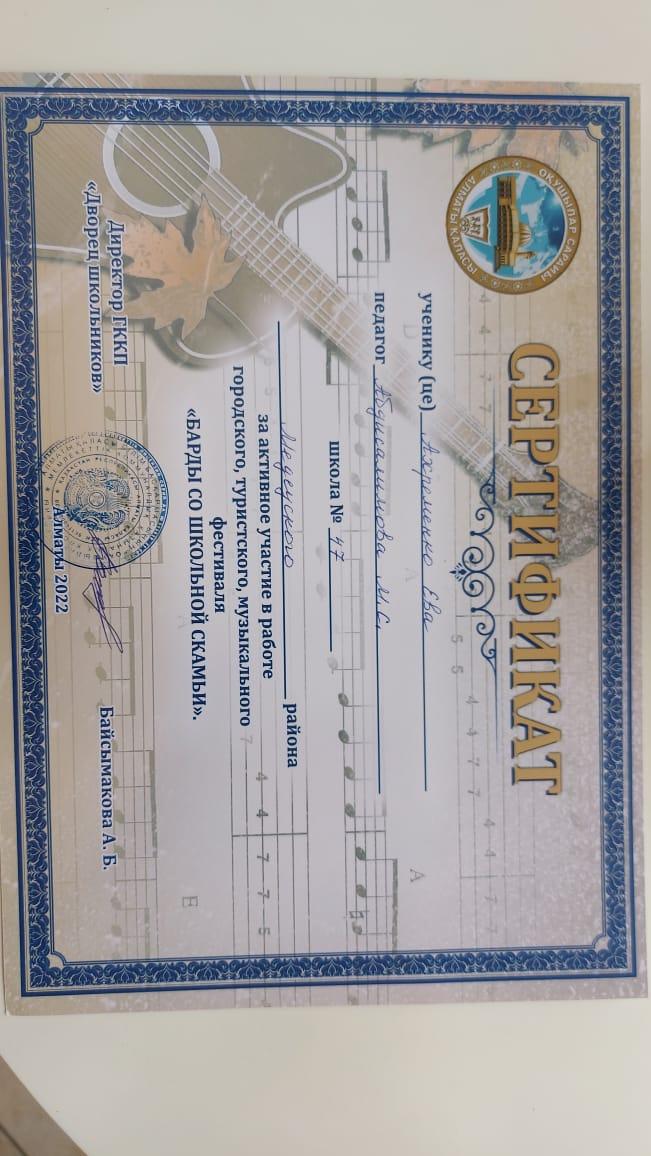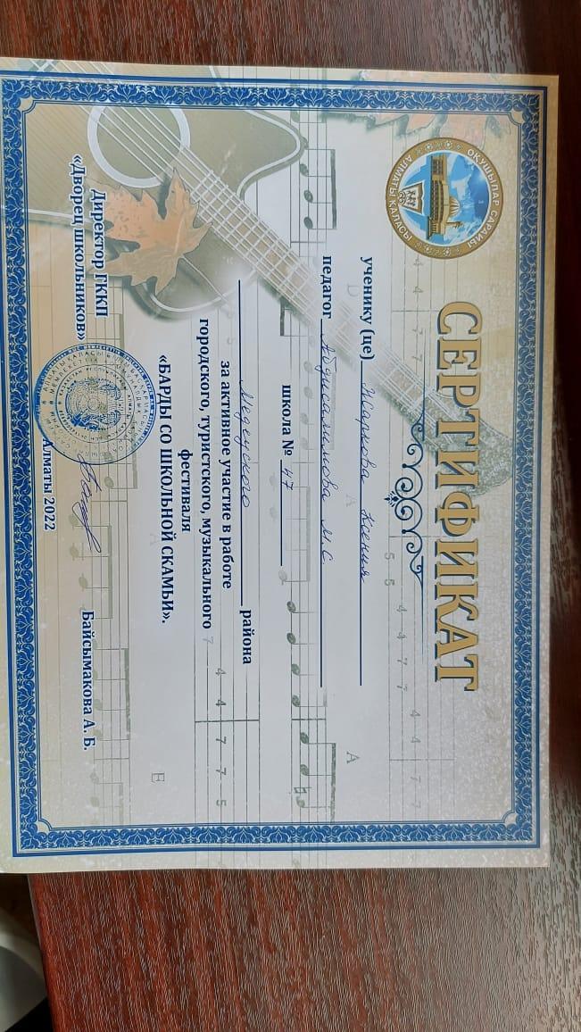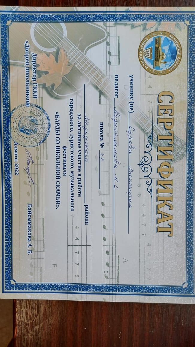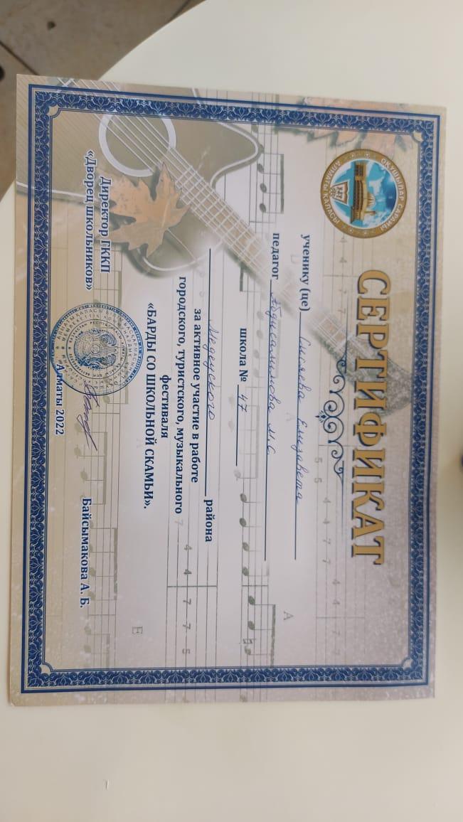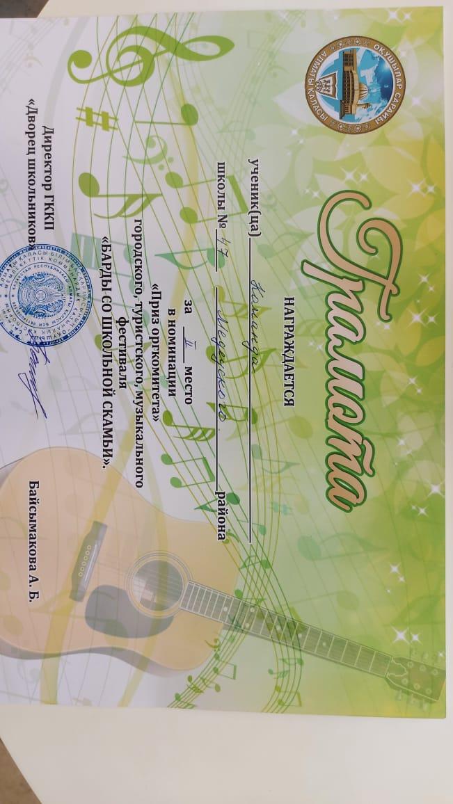 26 февраль 2022 0 1 2 3 4 5 "БАРД" әндері байқауы Алматы қаласы "Оқушылар сарайы" туристік өлкетану бөлімінің "Жаяу туризм" бірлестігінің педагогы Джекешова Кенже Үркімбайқызының жетекшілігімен үйірмеге қатысушылар, Бард бағытындағы әндердің фестивальіне қатысып, жүлделі екінші орынға ие болды.
