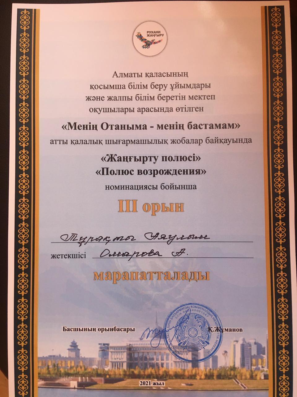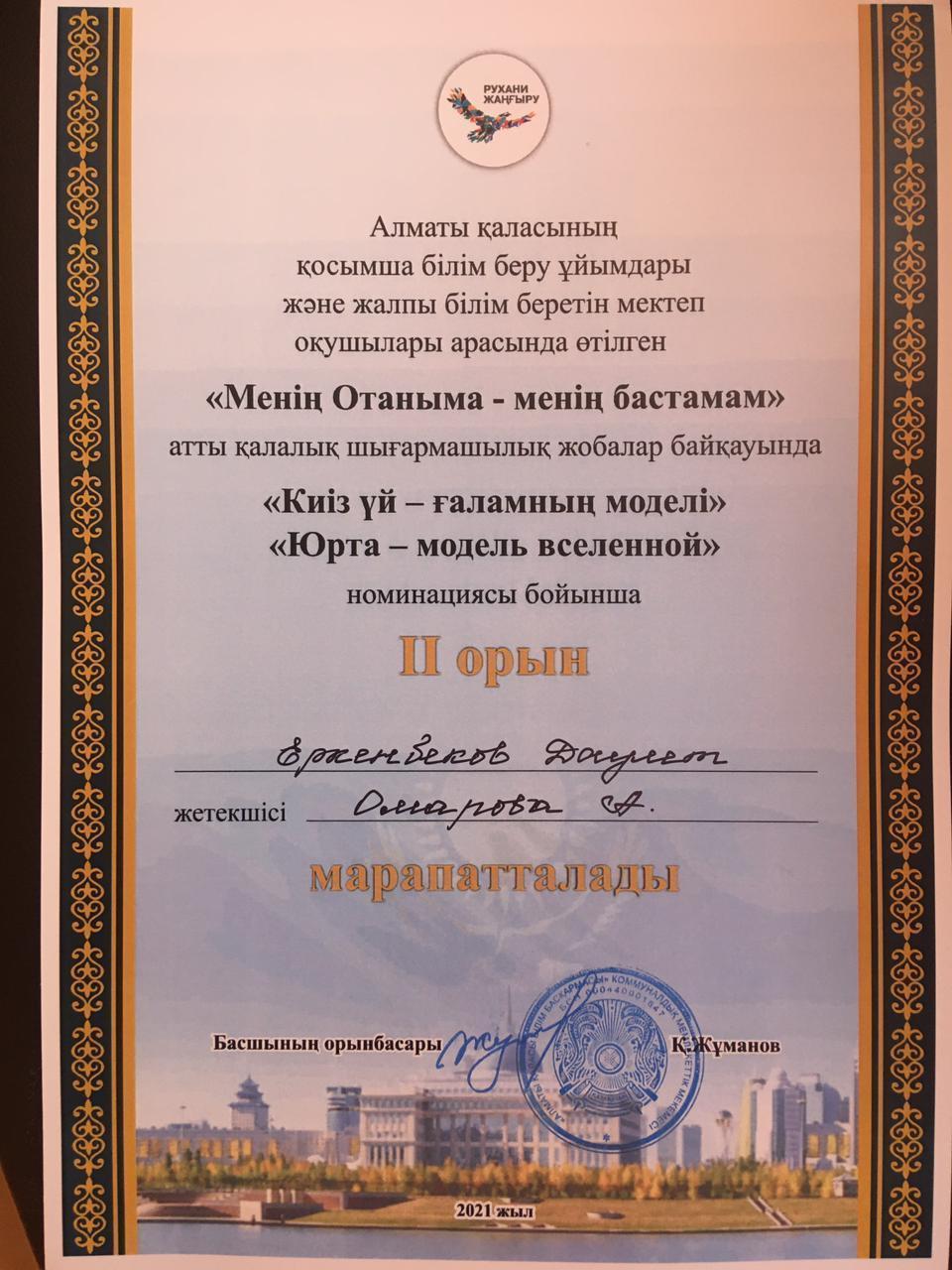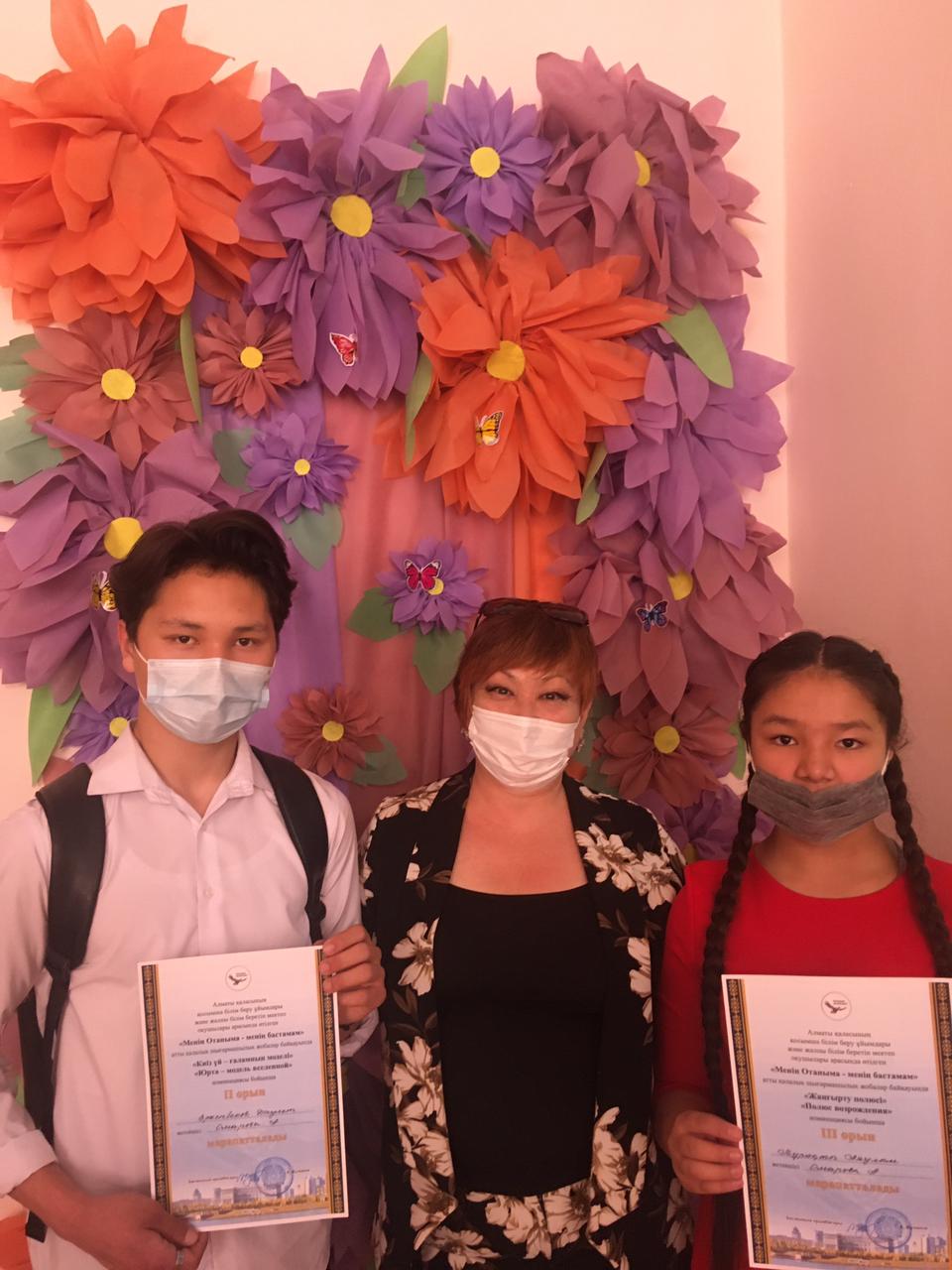 11 май 2021 0 1 2 3 4 5 Қалалық байқау Оқушылар сарайында өткен, "Менің Отаным - менің бастамам" қалалық шығармашылық жобалар байқауының жеңімпаздары: 9 "Ә" сынып оқушысы Еркенбеков Дәулет, 5 "Ә" сынып оқушысы Тұрақты Аяулым, жетекшісі көркем еңбек пәнінің мұғалімі Омарова Аида.