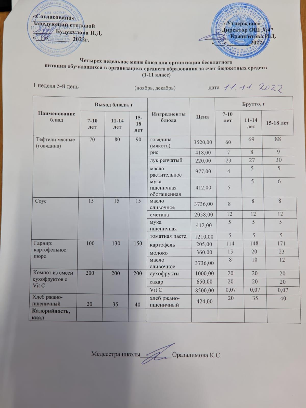 Четырехнедельное меню блюд для организации бесплатного питания обучающихся в организациях среднего образования за счет бюджетных средств