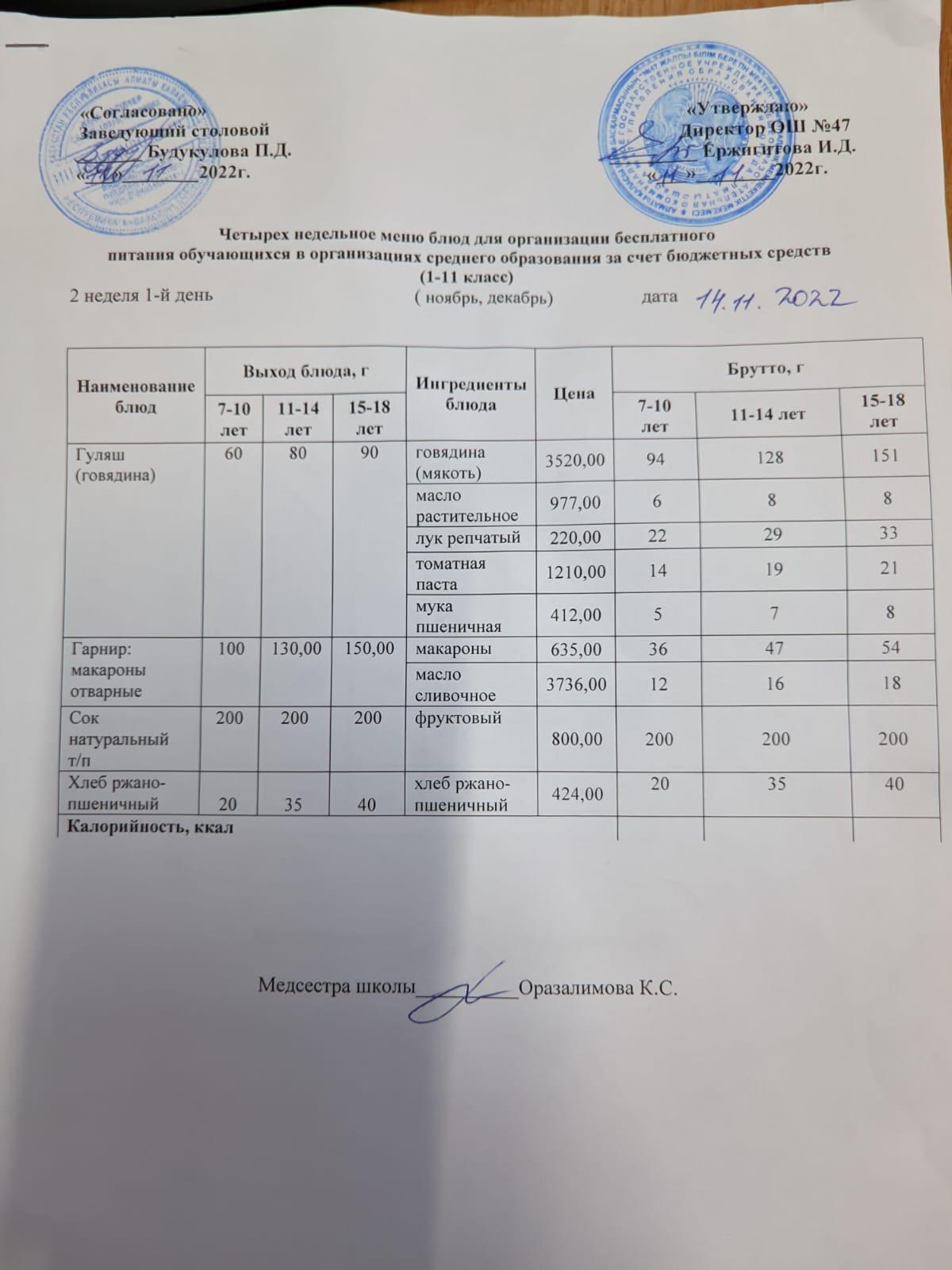 Четырехнедельное меню блюд для организации бесплатного питания обучающихся в организациях среднего образования за счет бюджетных средств