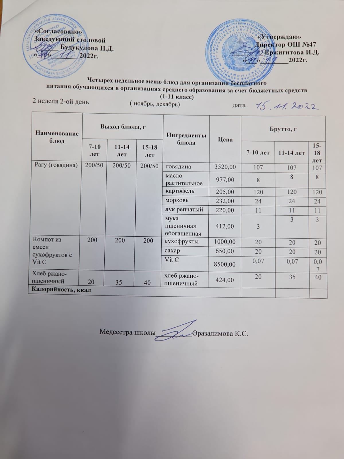 Бюджет қаражаты есебінен орта білім беру ұйымдарында білім алушыларды тегін тамақтандыруды ұйымдастыру үшін төрт апталық ас мәзірі/ Четырехнедельное меню блюд для организации бесплатного питания обучающихся в организациях среднего образования за счет бюджетных средств