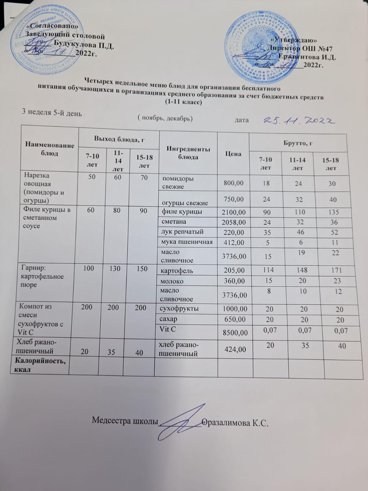 Бюджет қаражаты есебінен орта білім беру ұйымдарында білім алушыларды тегін тамақтандыруды ұйымдастыру үшін төрт апталық ас мәзірі/ Четырехнедельное меню блюд для организации бесплатного питания обучающихся в организациях среднего образования за счет бюджетных средств