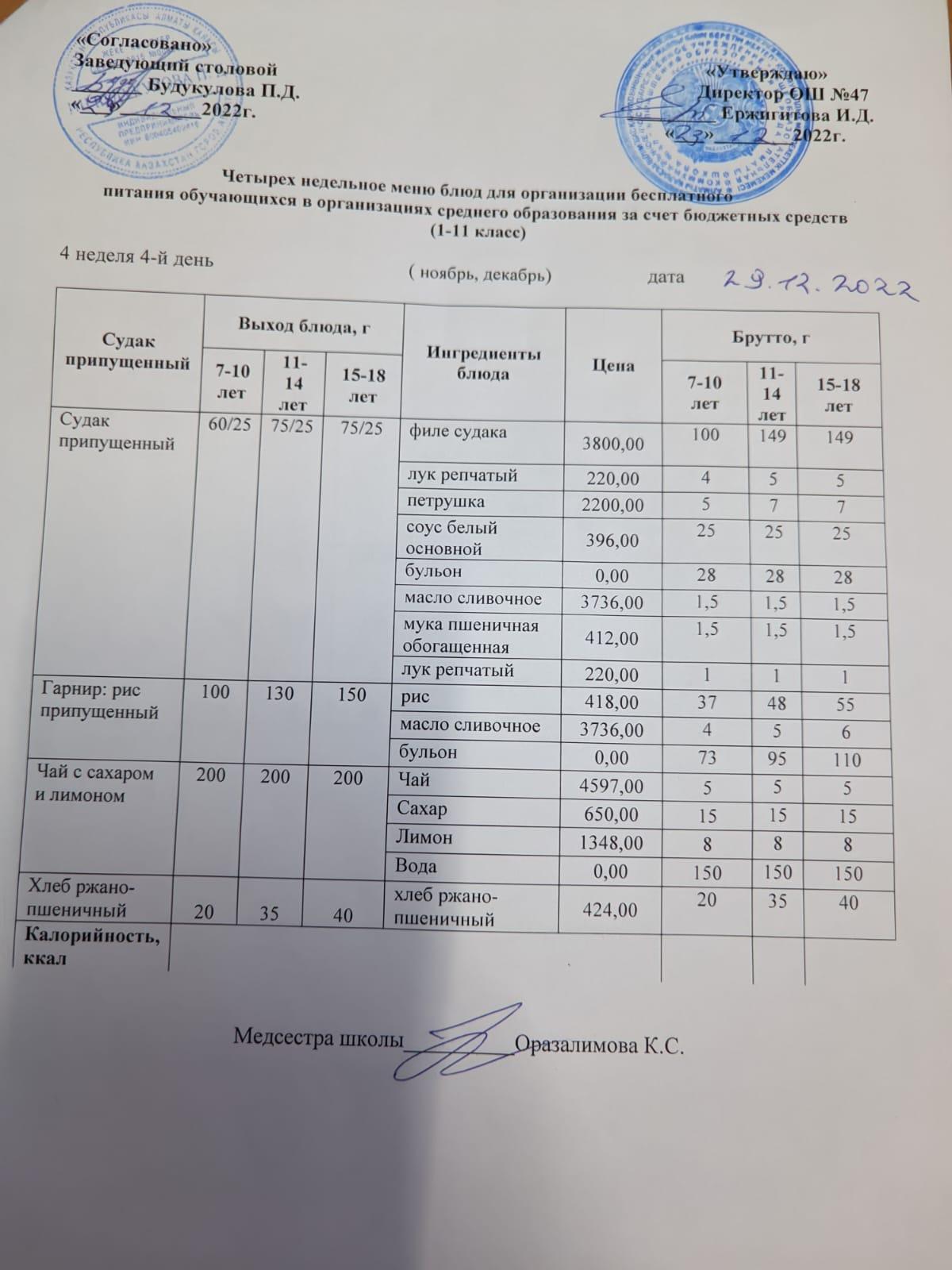 Бюджет қаражаты есебінен орта білім беру ұйымдарында білім алушыларды тегін тамақтандыруды ұйымдастыру үшін төрт апталық ас мәзірі/ Четырехнедельное меню блюд для организации бесплатного питания обучающихся в организациях среднего образования за счет бюджетных средств