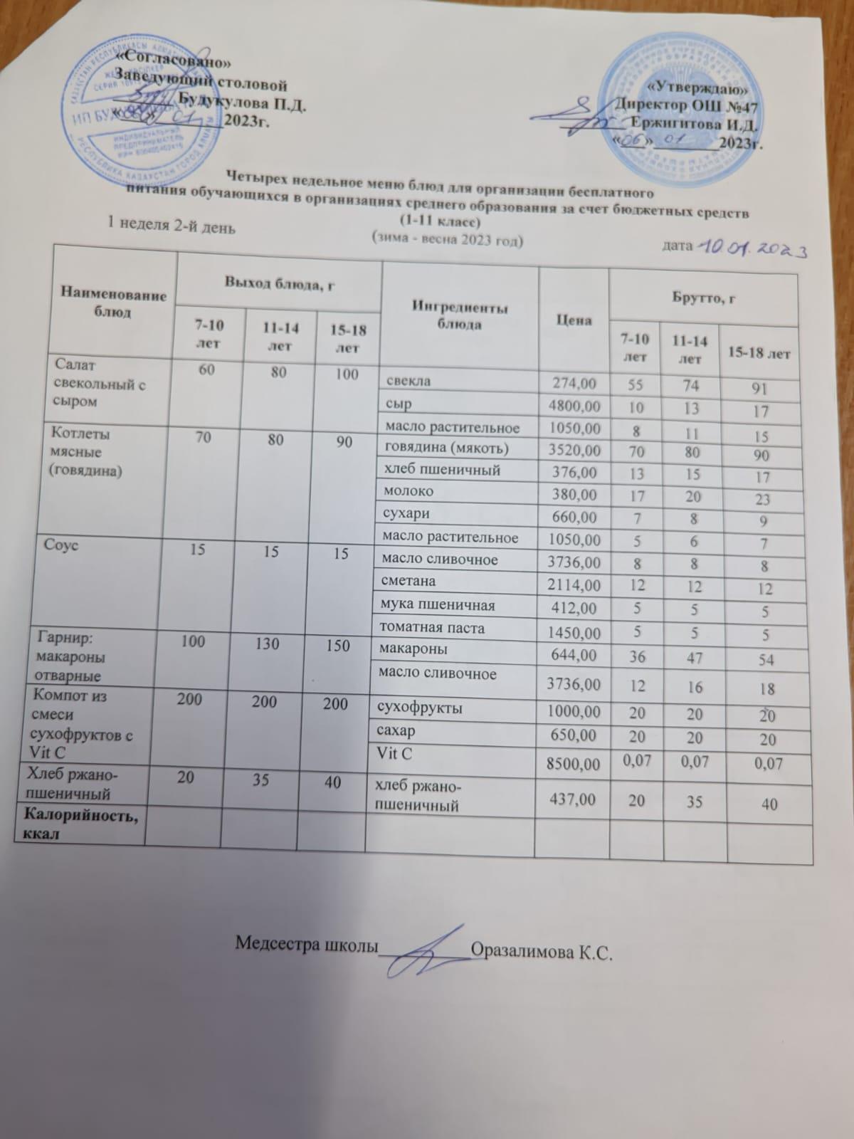 Бюджет қаражаты есебінен орта білім беру ұйымдарында білім алушыларды тегін тамақтандыруды ұйымдастыру үшін төрт апталық ас мәзірі/ Четырехнедельное меню блюд для организации бесплатного питания обучающихся в организациях среднего образования за счет бюджетных средств