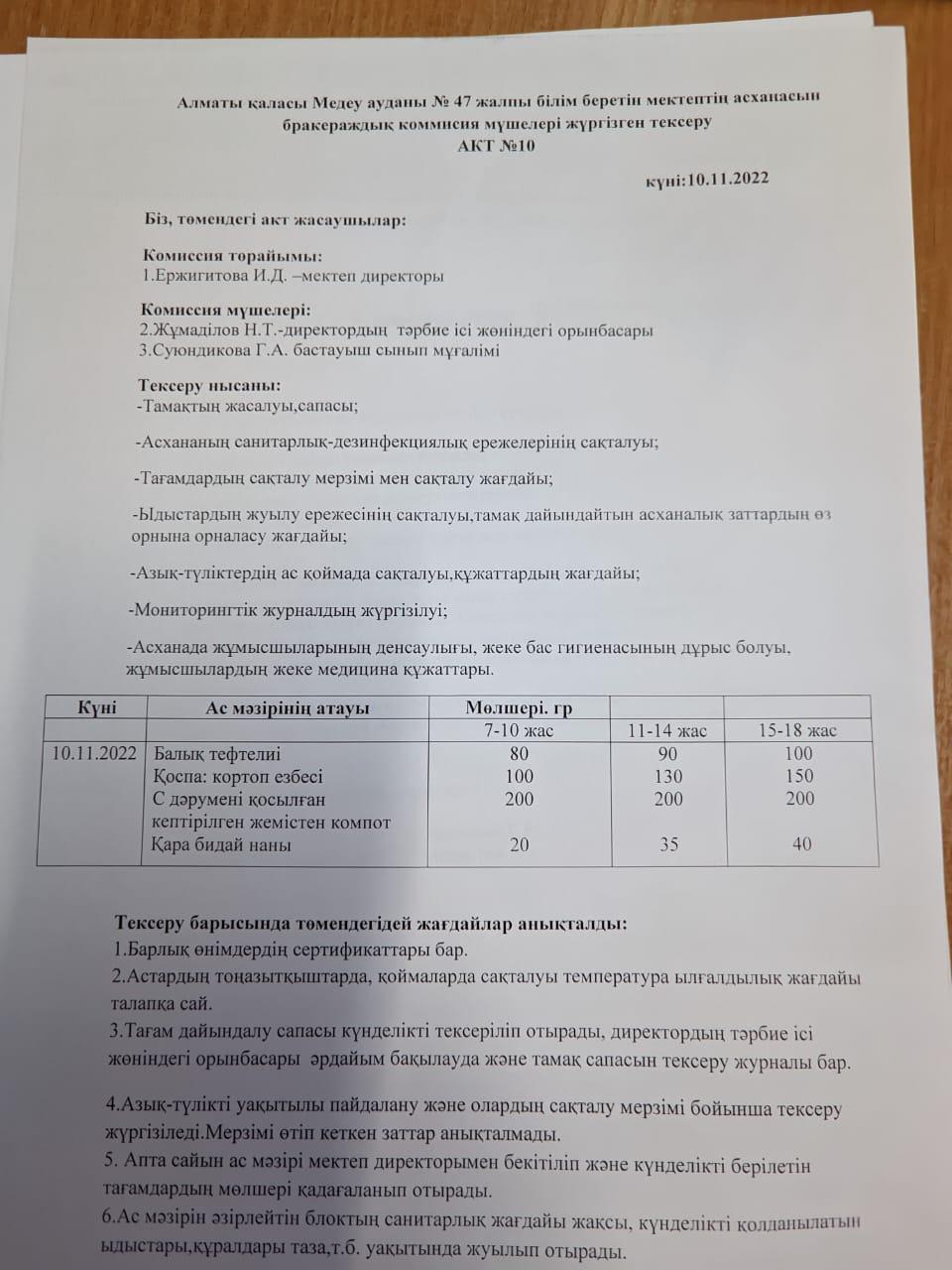 10 ноябрь 2022 0 1 2 3 4 5 Алматы қаласы Медеу ауданы №47жалпы білім беретін мектептің асханасын бракераждық комиссия мүшелері жүргізген тексеру АКТ-сі