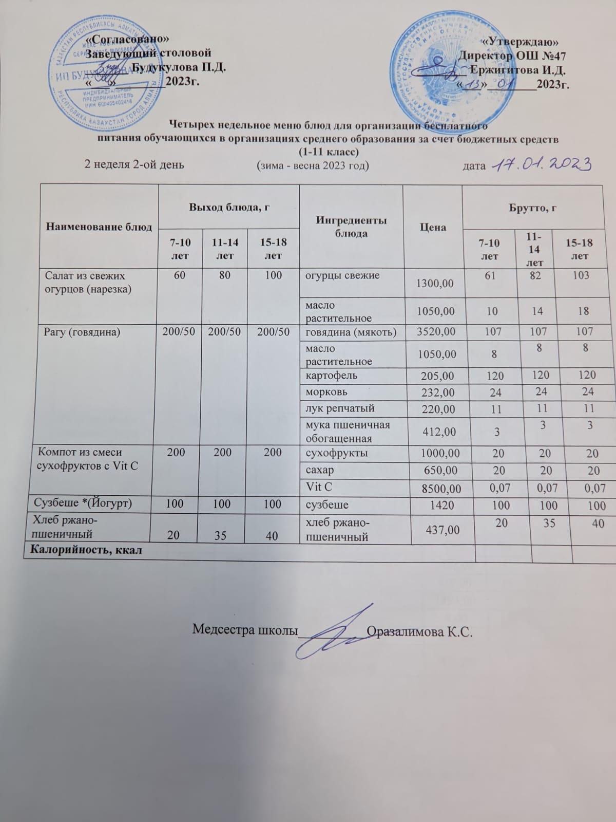 Бюджет қаражаты есебінен орта білім беру ұйымдарында білім алушыларды тегін тамақтандыруды ұйымдастыру үшін төрт апталық ас мәзірі/ Четырехнедельное меню блюд для организации бесплатного питания обучающихся в организациях среднего образования за счет бюджетных средств