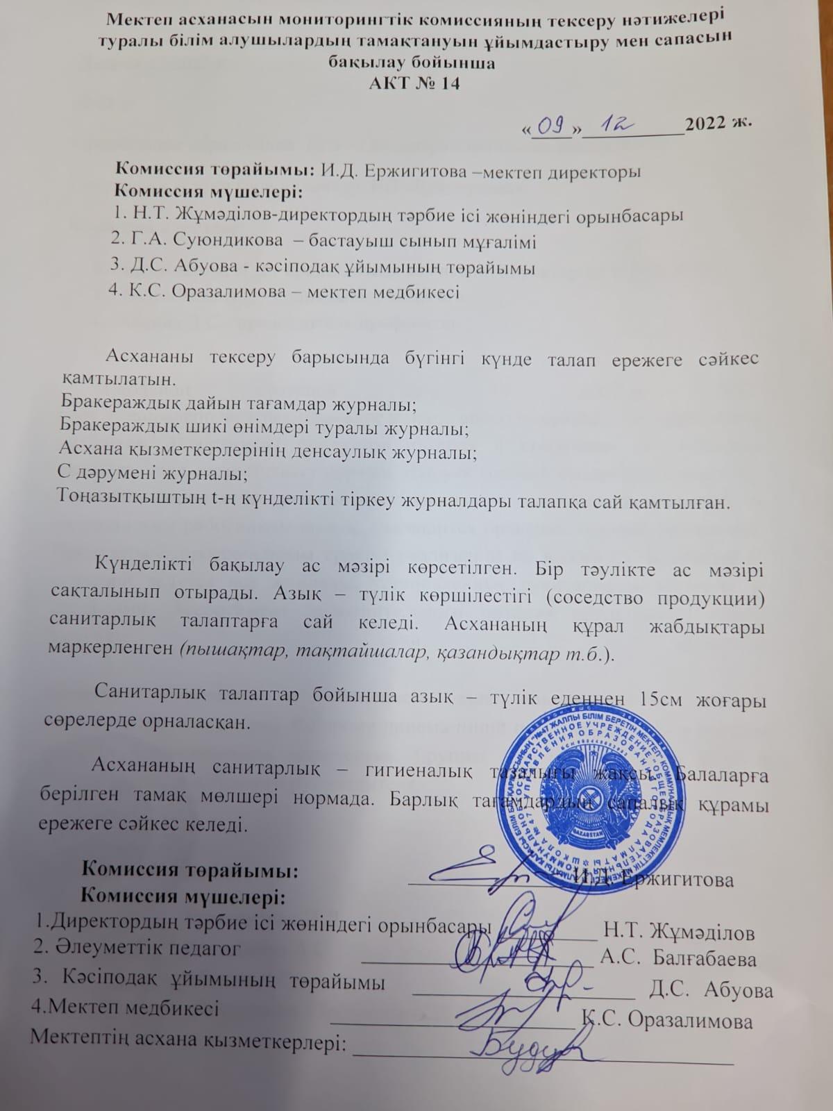 09 декабрь 2022 0 1 2 3 4 5 Мектеп асханасын мониторингтік комиссияның тексеру нәтижелері Мектеп асханасын мониторингтік комиссияның тексеру нәтижелері туралы білім алушылардың тамақтануын ұйымдастыру мен сапасын бақылау бойынша АКТ № 14