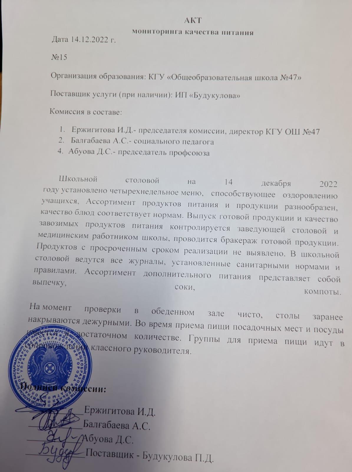 » АКТ мониторинга качества питания