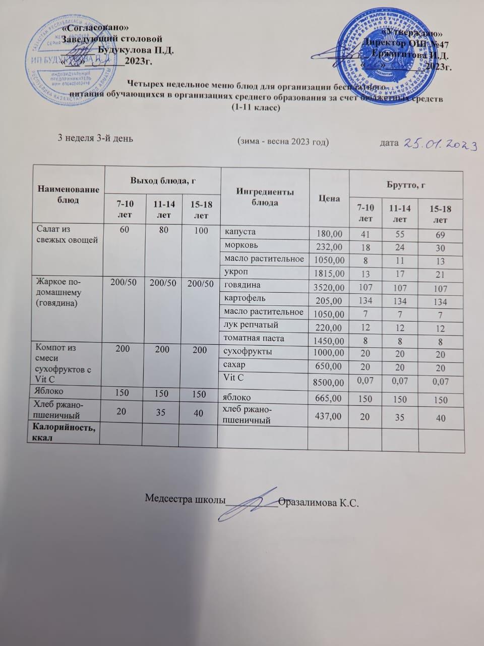 Бюджет қаражаты есебінен орта білім беру ұйымдарында білім алушыларды тегін тамақтандыруды ұйымдастыру үшін төрт апталық ас мәзірі/ Четырехнедельное меню блюд для организации бесплатного питания обучающихся в организациях среднего образования за счет бюджетных средств
