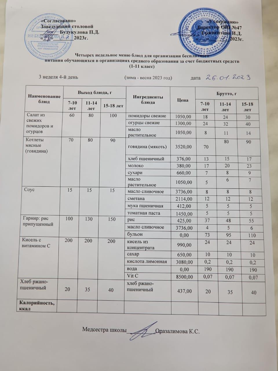 Бюджет қаражаты есебінен орта білім беру ұйымдарында білім алушыларды тегін тамақтандыруды ұйымдастыру үшін төрт апталық ас мәзірі/ Четырехнедельное меню блюд для организации бесплатного питания обучающихся в организациях среднего образования за счет бюджетных средств