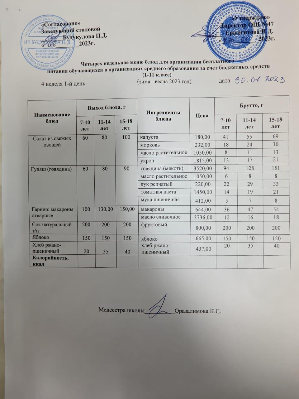 Бюджет қаражаты есебінен орта білім беру ұйымдарында білім алушыларды тегін тамақтандыруды ұйымдастыру үшін төрт апталық ас мәзірі/ Четырехнедельное меню блюд для организации бесплатного питания обучающихся в организациях среднего образования за счет бюджетных средств