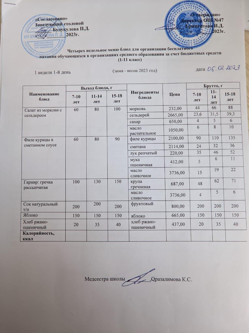 Бюджет қаражаты есебінен орта білім беру ұйымдарында білім алушыларды тегін тамақтандыруды ұйымдастыру үшін төрт апталық ас мәзірі/ Четырехнедельное меню блюд для организации бесплатного питания обучающихся в организациях среднего образования за счет бюджетных средств