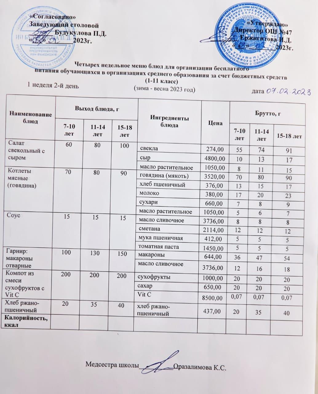 Бюджет қаражаты есебінен орта білім беру ұйымдарында білім алушыларды тегін тамақтандыруды ұйымдастыру үшін төрт апталық ас мәзірі/ Четырехнедельное меню блюд для организации бесплатного питания обучающихся в организациях среднего образования за счет бюджетных средств