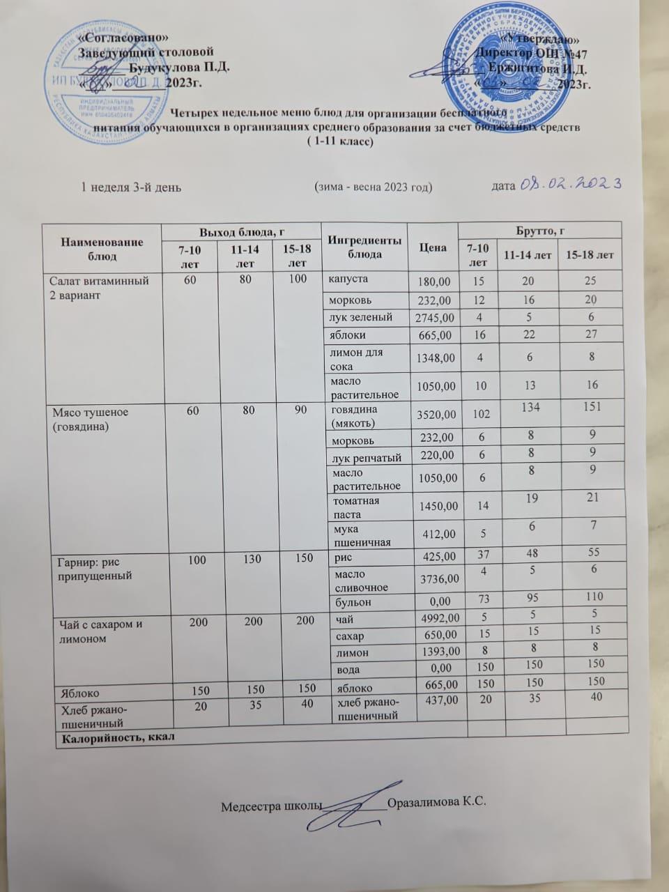 Бюджет қаражаты есебінен орта білім беру ұйымдарында білім алушыларды тегін тамақтандыруды ұйымдастыру үшін төрт апталық ас мәзірі/ Четырехнедельное меню блюд для организации бесплатного питания обучающихся в организациях среднего образования за счет бюджетных средств