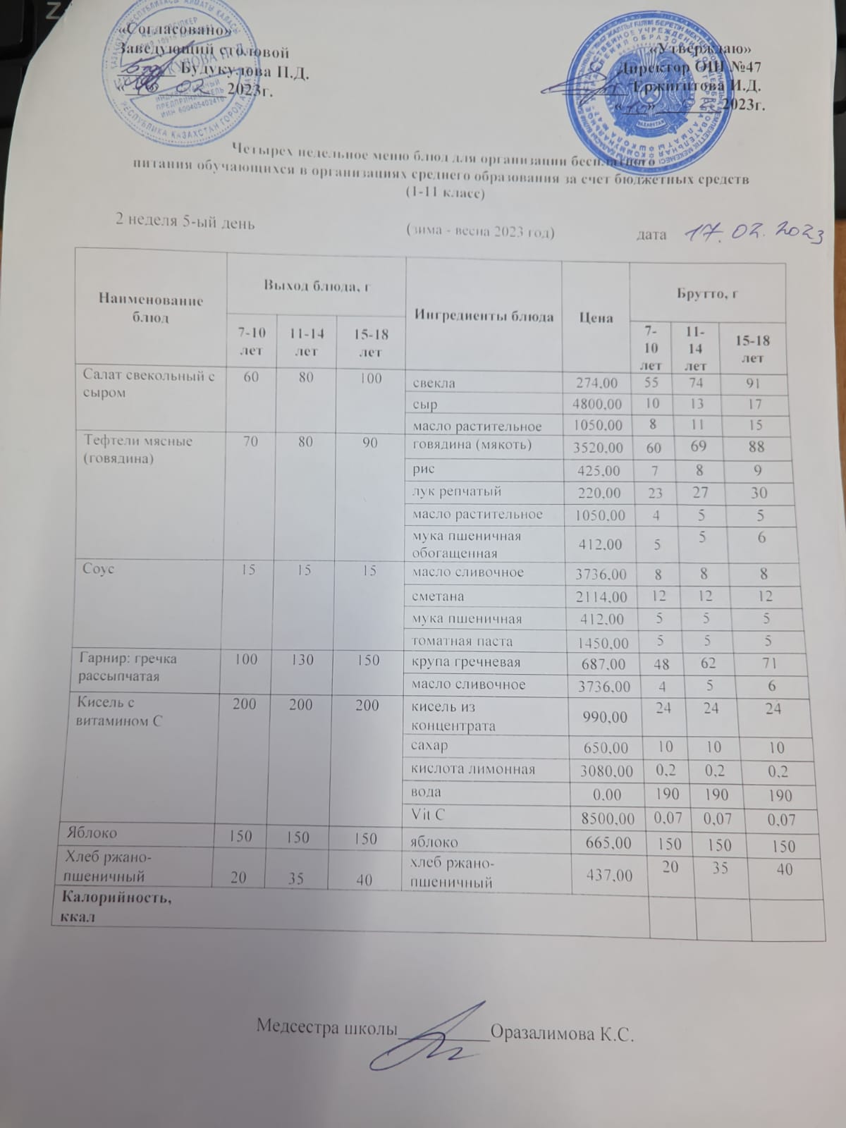 Бюджет қаражаты есебінен орта білім беру ұйымдарында білім алушыларды тегін тамақтандыруды ұйымдастыру үшін төрт апталық ас мәзірі/ Четырехнедельное меню блюд для организации бесплатного питания обучающихся в организациях среднего образования за счет бюджетных средств