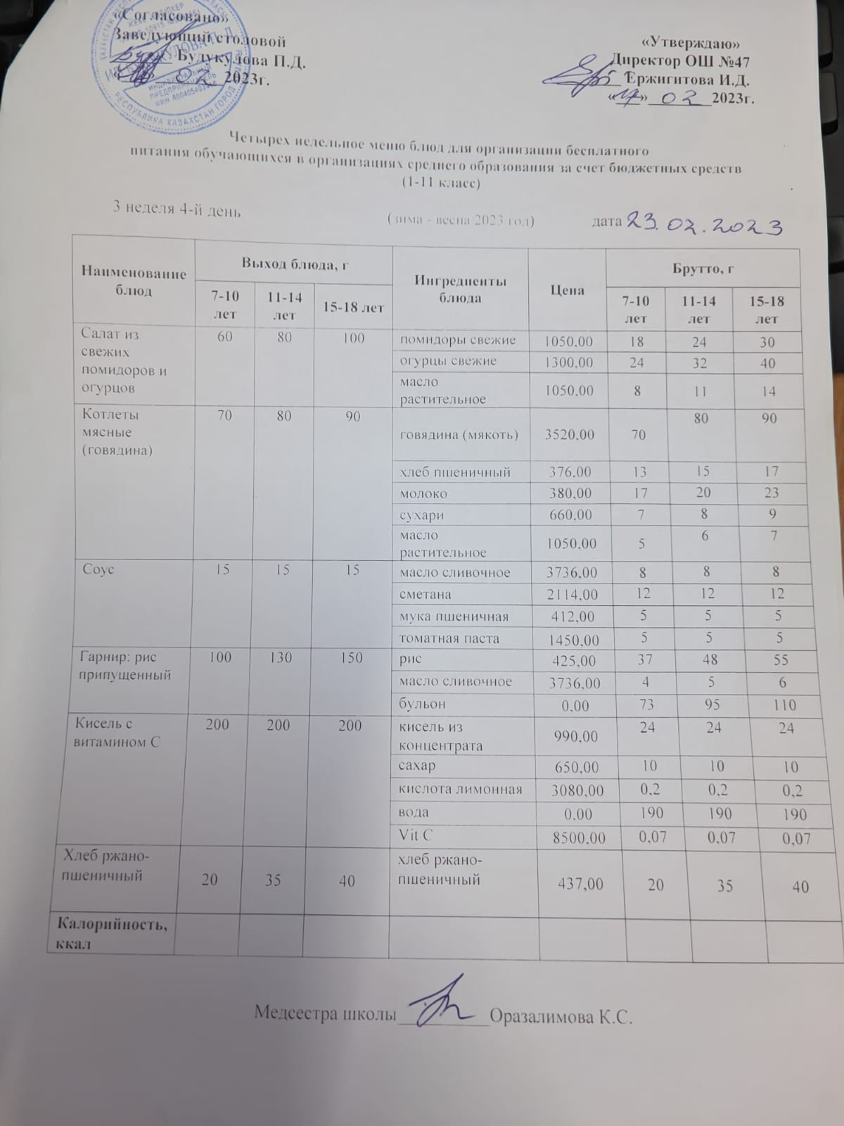 Бюджет қаражаты есебінен орта білім беру ұйымдарында білім алушыларды тегін тамақтандыруды ұйымдастыру үшін төрт апталық ас мәзірі/ Четырехнедельное меню блюд для организации бесплатного питания обучающихся в организациях среднего образования за счет бюджетных средств