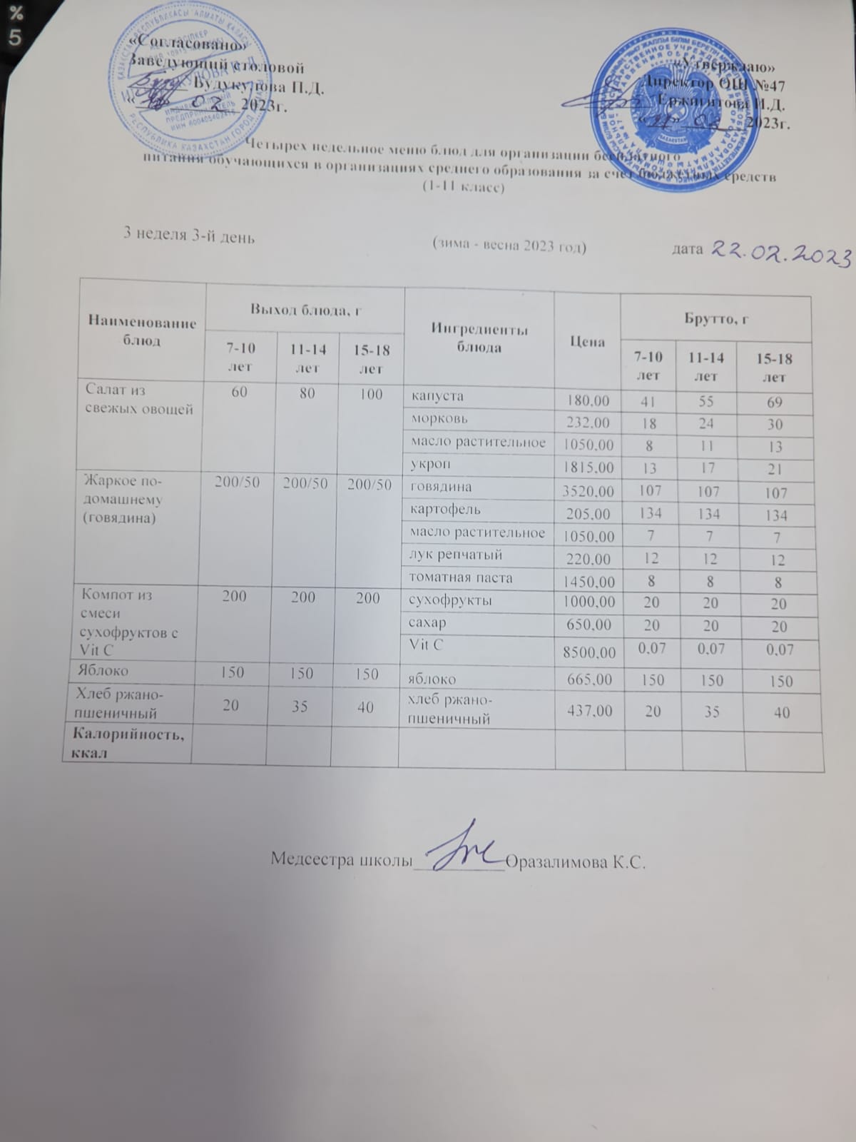 Бюджет қаражаты есебінен орта білім беру ұйымдарында білім алушыларды тегін тамақтандыруды ұйымдастыру үшін төрт апталық ас мәзірі/ Четырехнедельное меню блюд для организации бесплатного питания обучающихся в организациях среднего образования за счет бюджетных средств