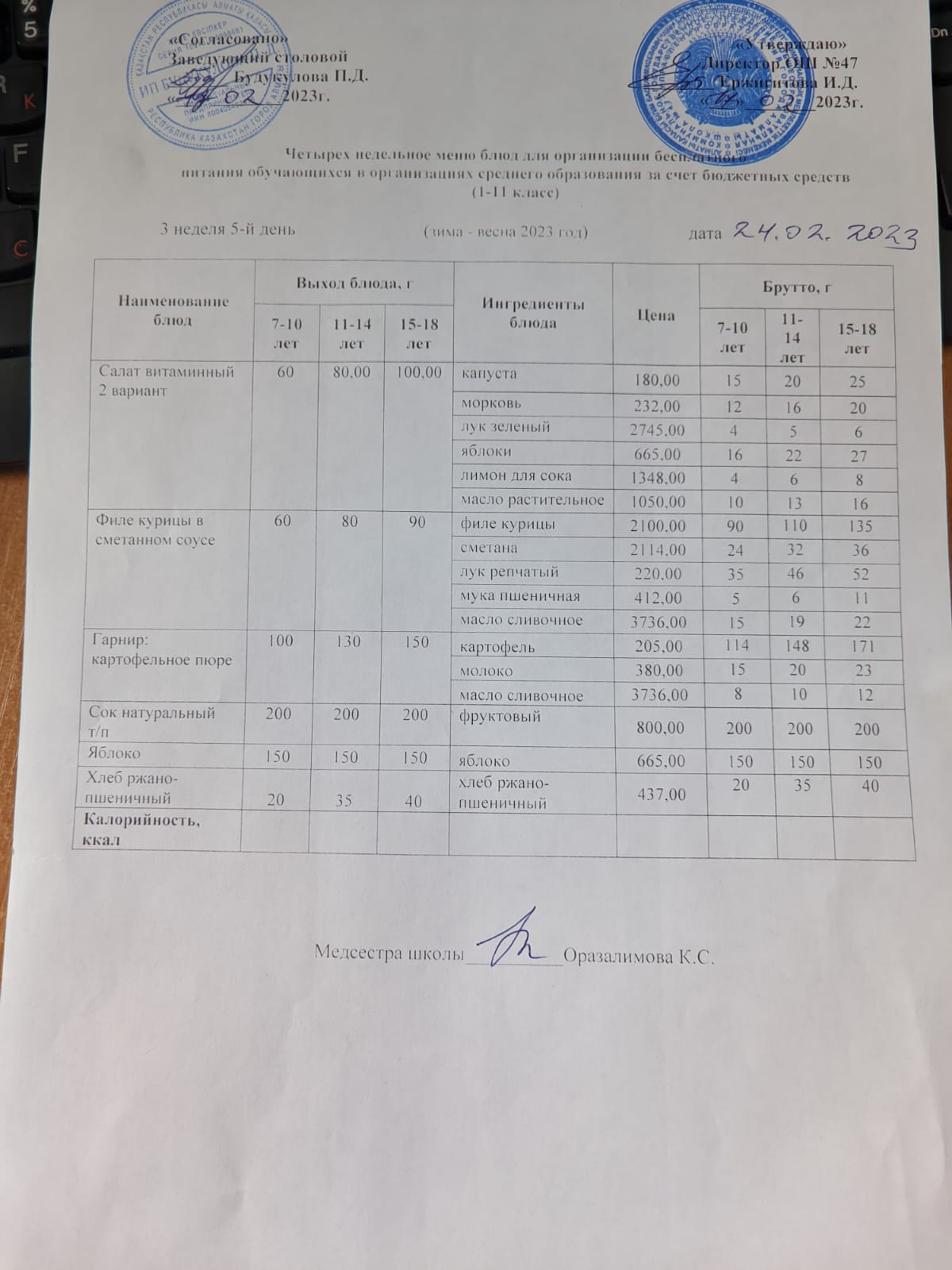 Бюджет қаражаты есебінен орта білім беру ұйымдарында білім алушыларды тегін тамақтандыруды ұйымдастыру үшін төрт апталық ас мәзірі/ Четырехнедельное меню блюд для организации бесплатного питания обучающихся в организациях среднего образования за счет бюджетных средств