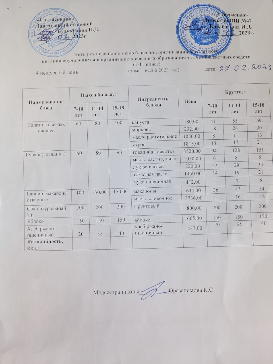 Бюджет қаражаты есебінен орта білім беру ұйымдарында білім алушыларды тегін тамақтандыруды ұйымдастыру үшін төрт апталық ас мәзірі/ Четырехнедельное меню блюд для организации бесплатного питания обучающихся в организациях среднего образования за счет бюджетных средств