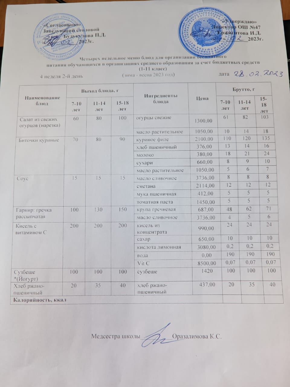Бюджет қаражаты есебінен орта білім беру ұйымдарында білім алушыларды тегін тамақтандыруды ұйымдастыру үшін төрт апталық ас мәзірі/ Четырехнедельное меню блюд для организации бесплатного питания обучающихся в организациях среднего образования за счет бюджетных средств