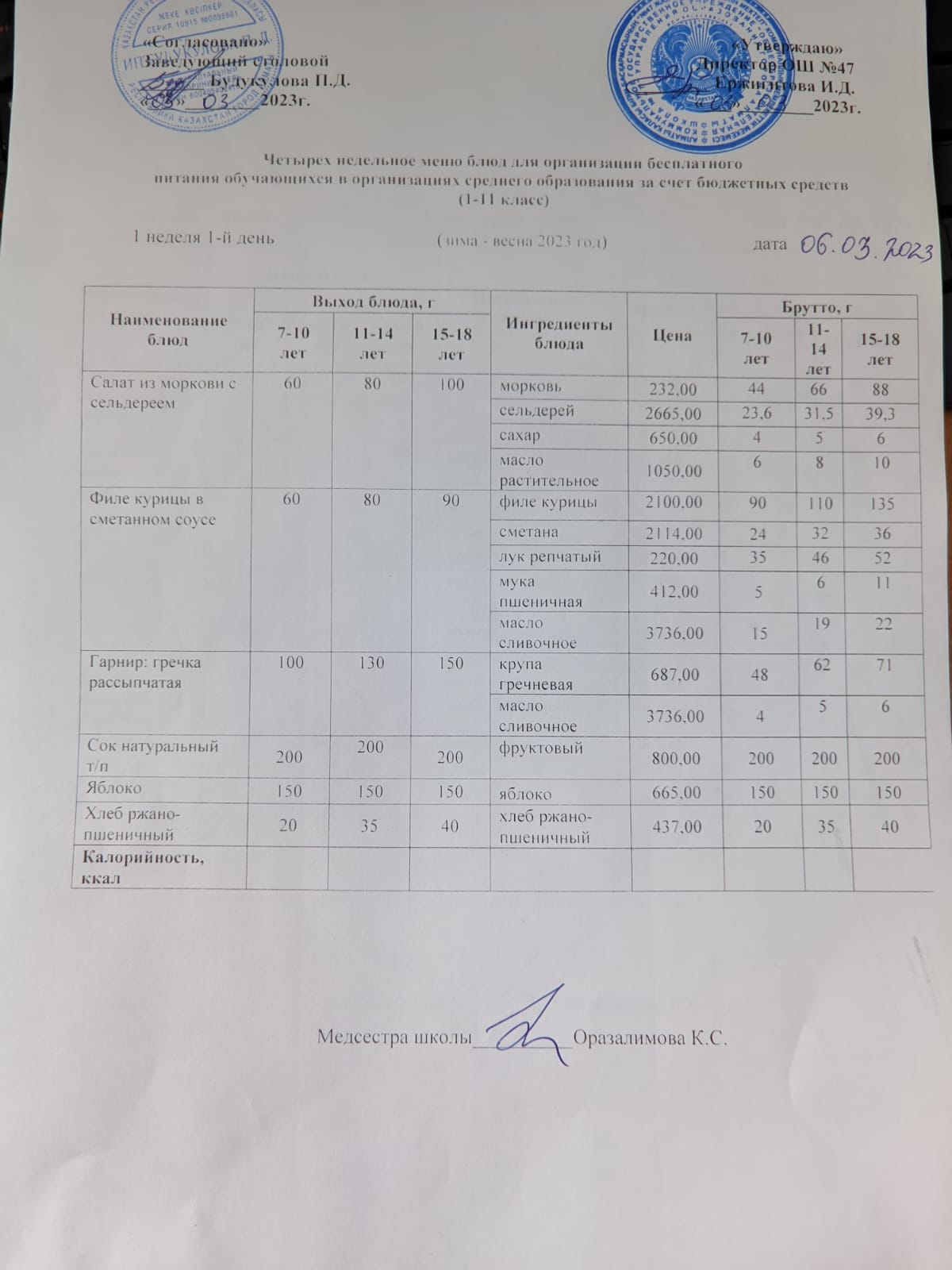 Бюджет қаражаты есебінен орта білім беру ұйымдарында білім алушыларды тегін тамақтандыруды ұйымдастыру үшін төрт апталық ас мәзірі/ Четырехнедельное меню блюд для организации бесплатного питания обучающихся в организациях среднего образования за счет бюджетных средств