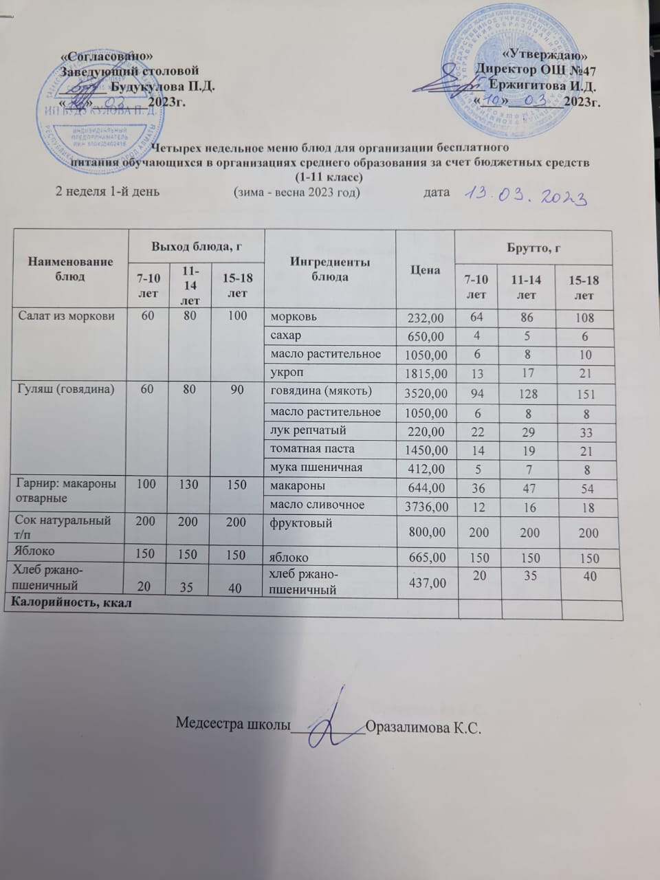 Бюджет қаражаты есебінен орта білім беру ұйымдарында білім алушыларды тегін тамақтандыруды ұйымдастыру үшін төрт апталық ас мәзірі/ Четырехнедельное меню блюд для организации бесплатного питания обучающихся в организациях среднего образования за счет бюджетных средств