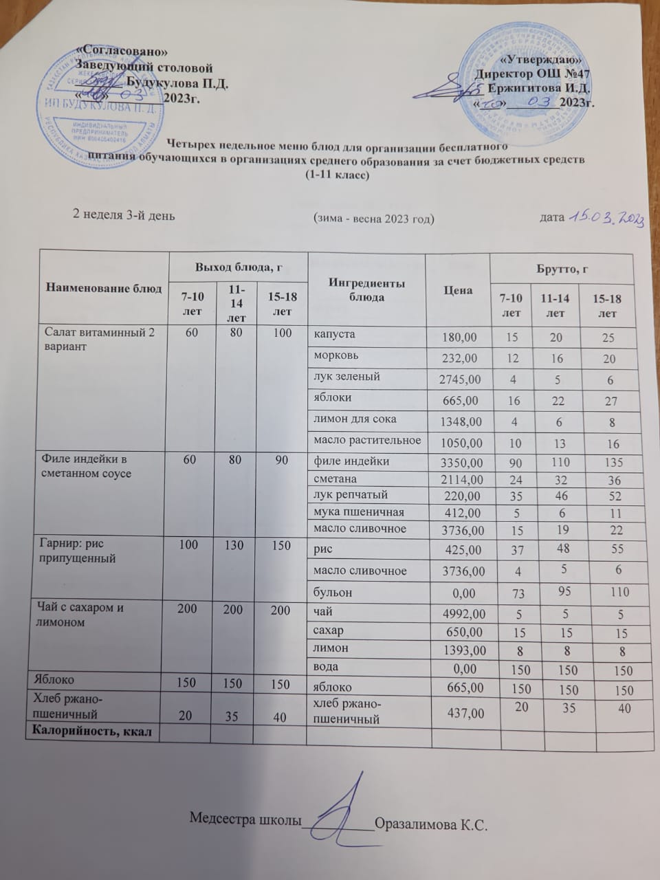 Бюджет қаражаты есебінен орта білім беру ұйымдарында білім алушыларды тегін тамақтандыруды ұйымдастыру үшін төрт апталық ас мәзірі/ Четырехнедельное меню блюд для организации бесплатного питания обучающихся в организациях среднего образования за счет бюджетных средств