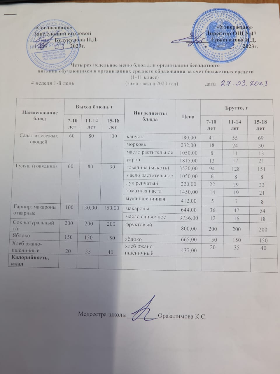 Бюджет қаражаты есебінен орта білім беру ұйымдарында білім алушыларды тегін тамақтандыруды ұйымдастыру үшін төрт апталық ас мәзірі/ Четырехнедельное меню блюд для организации бесплатного питания обучающихся в организациях среднего образования за счет бюджетных средств
