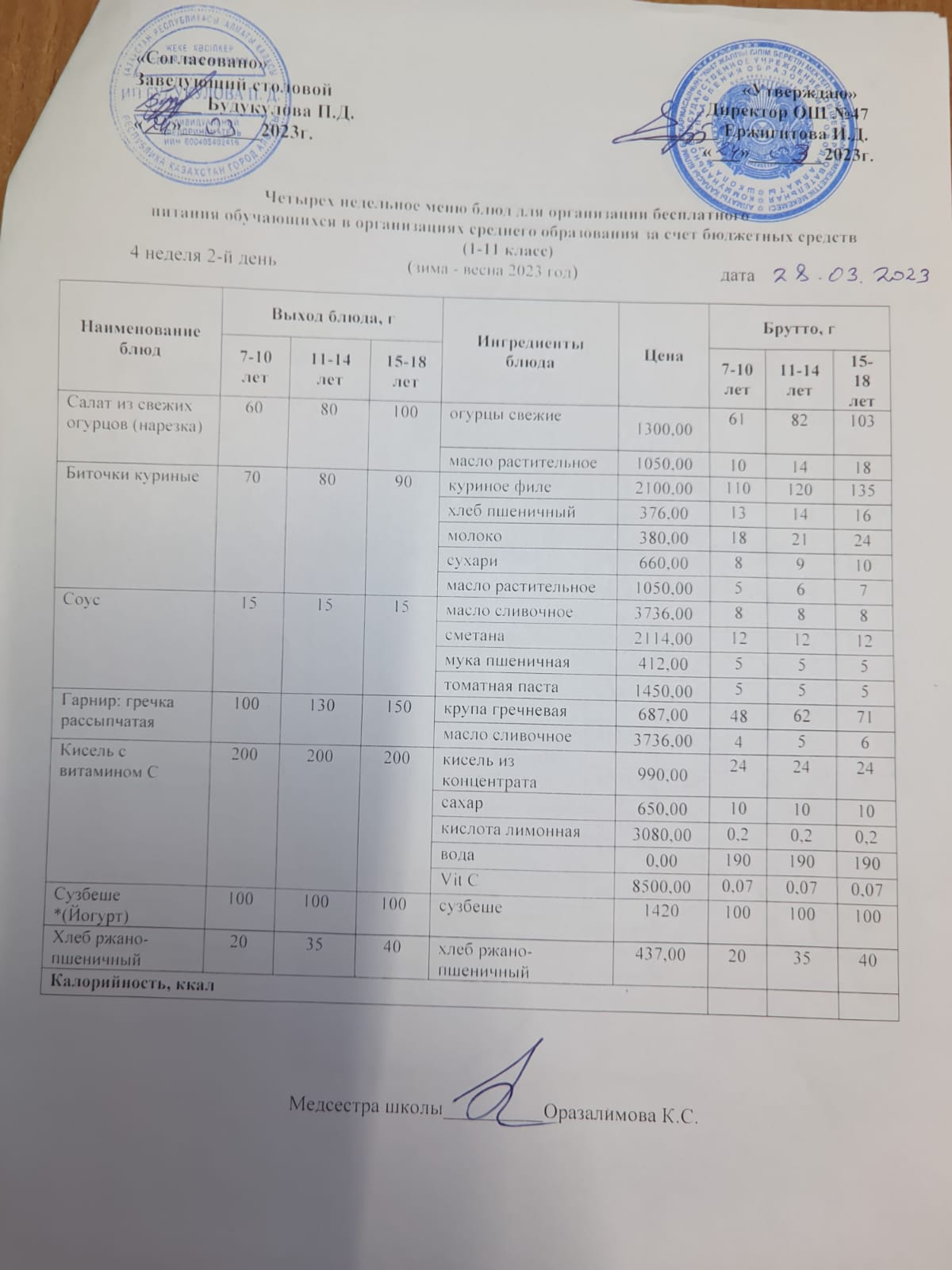 Бюджет қаражаты есебінен орта білім беру ұйымдарында білім алушыларды тегін тамақтандыруды ұйымдастыру үшін төрт апталық ас мәзірі/ Четырехнедельное меню блюд для организации бесплатного питания обучающихся в организациях среднего образования за счет бюджетных средств
