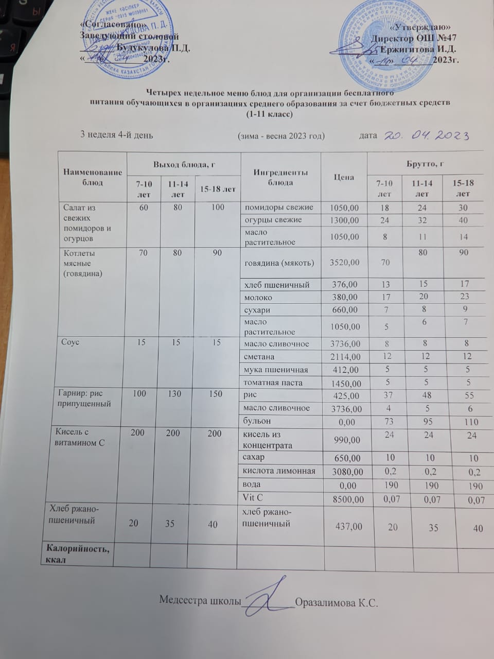 Бюджет қаражаты есебінен орта білім беру ұйымдарында білім алушыларды тегін тамақтандыруды ұйымдастыру үшін төрт апталық ас мәзірі/ Четырехнедельное меню блюд для организации бесплатного питания обучающихся в организациях среднего образования за счет бюджетных средств