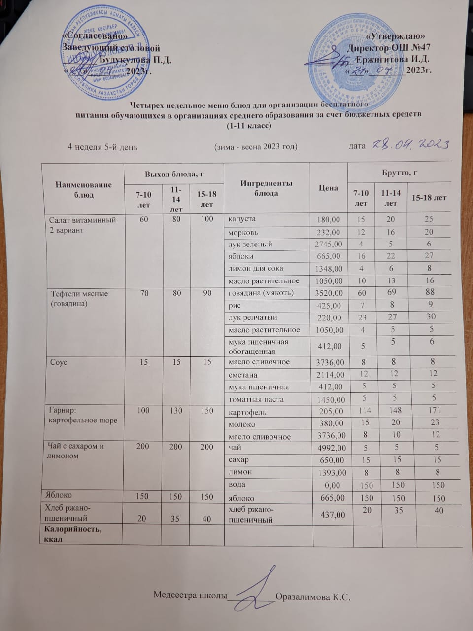 Бюджет қаражаты есебінен орта білім беру ұйымдарында білім алушыларды тегін тамақтандыруды ұйымдастыру үшін төрт апталық ас мәзірі/ Четырехнедельное меню блюд для организации бесплатного питания обучающихся в организациях среднего образования за счет бюджетных средств