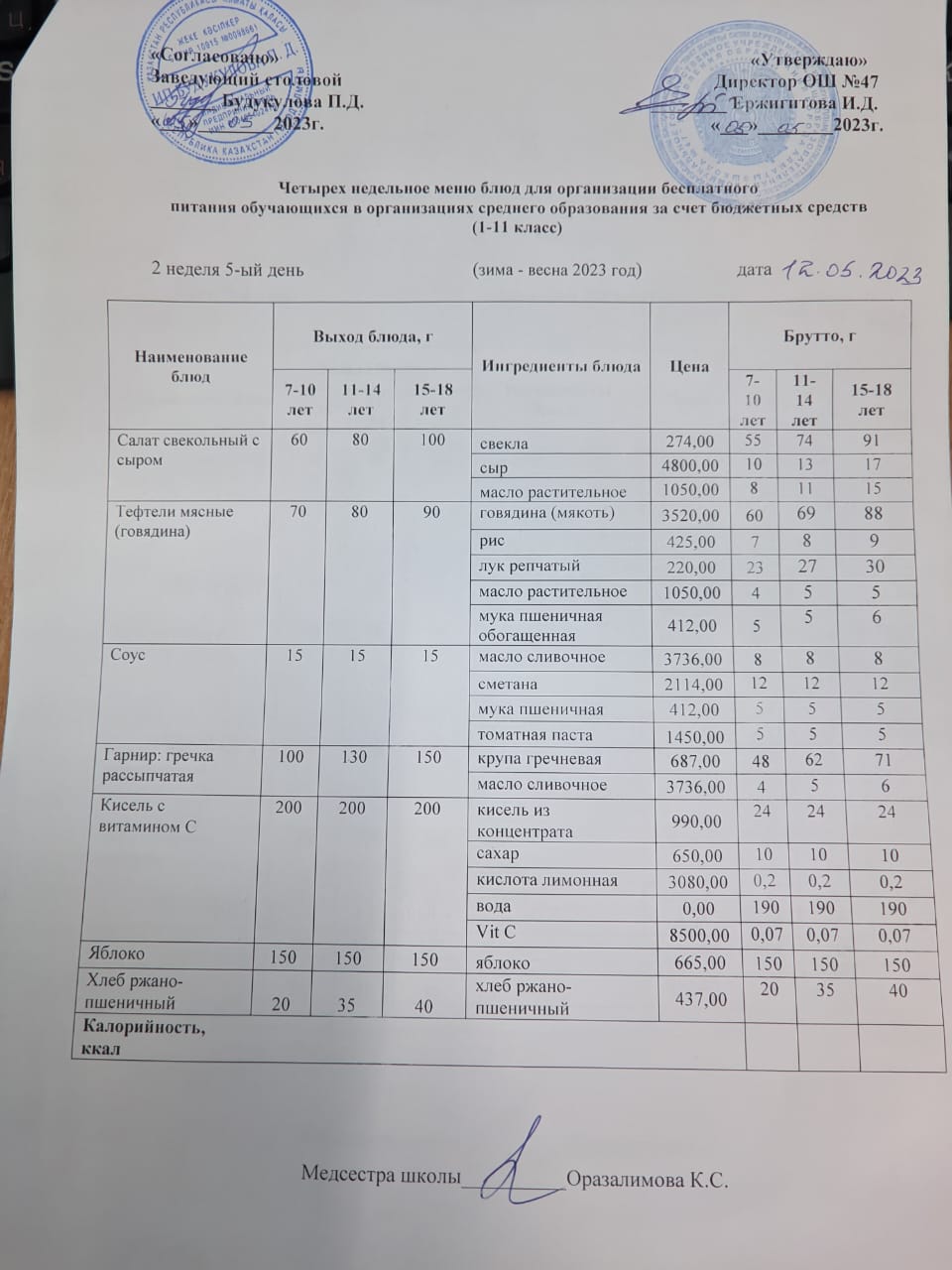 Бюджет қаражаты есебінен орта білім беру ұйымдарында білім алушыларды тегін тамақтандыруды ұйымдастыру үшін төрт апталық ас мәзірі/ Четырехнедельное меню блюд для организации бесплатного питания обучающихся в организациях среднего образования за счет бюджетных средств