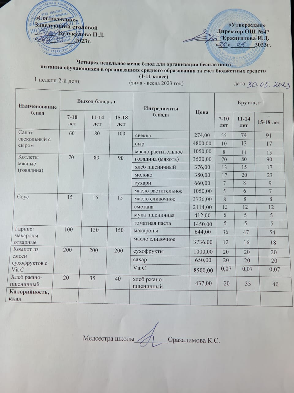Бюджет қаражаты есебінен орта білім беру ұйымдарында білім алушыларды тегін тамақтандыруды ұйымдастыру үшін төрт апталық ас мәзірі/ Четырехнедельное меню блюд для организации бесплатного питания обучающихся в организациях среднего образования за счет бюджетных средств
