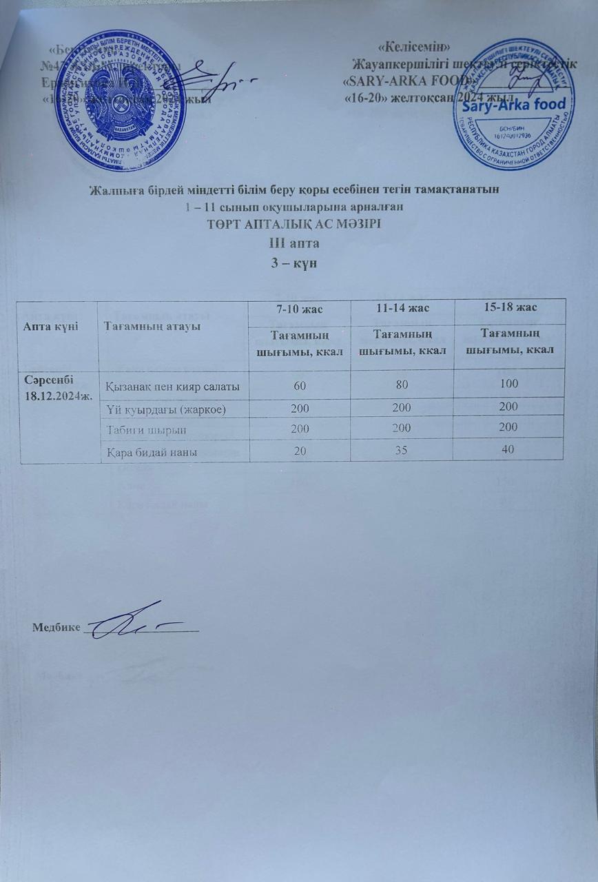 Бюджет қаражаты есебінен орта білім беру ұйымдарында білім алушыларды тегін тамақтандыруды ұйымдастыру үшін төрт апталық ас мәзірі/ Четырехнедельное меню блюд для организации бесплатного питания обучающихся в организациях среднего образования за счет бюджетных средств