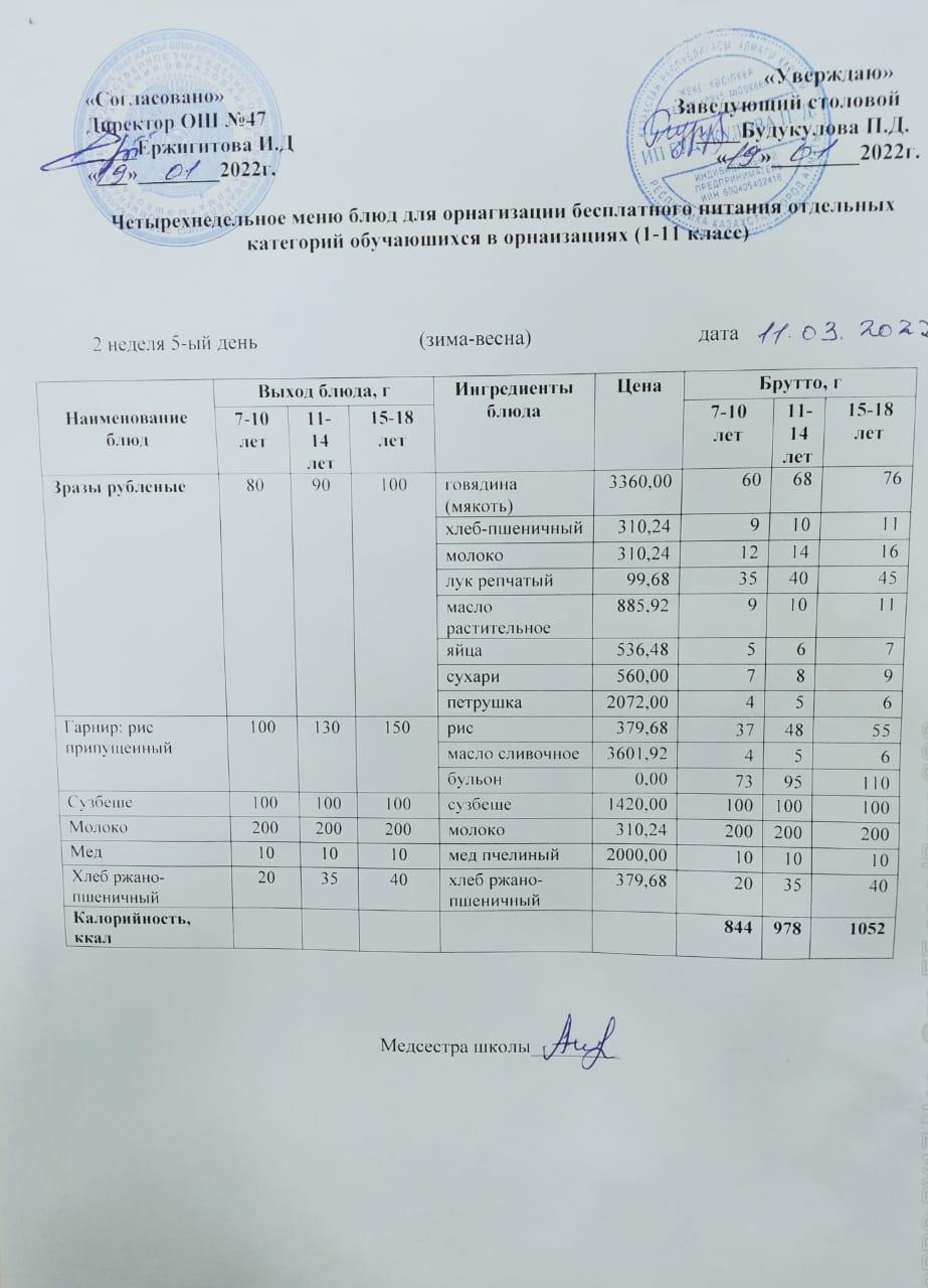 » МЕНЮ (Зима- Весна) 2 неделя 5 день 11.03.2022 г.