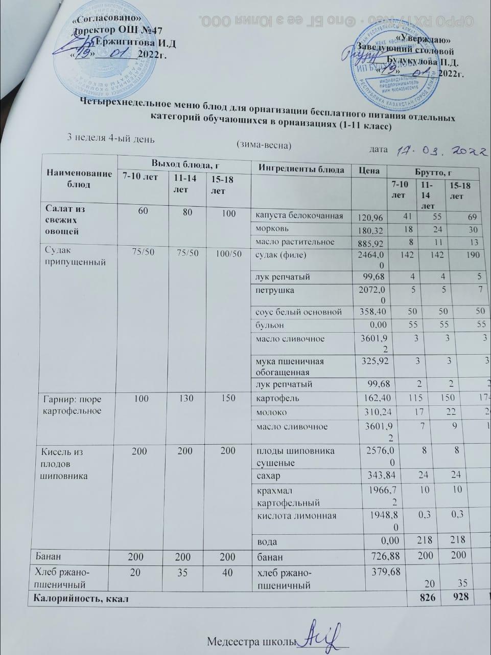 МЕНЮ (Зима- Весна) 3 неделя 4 день 17.03.2022 г.