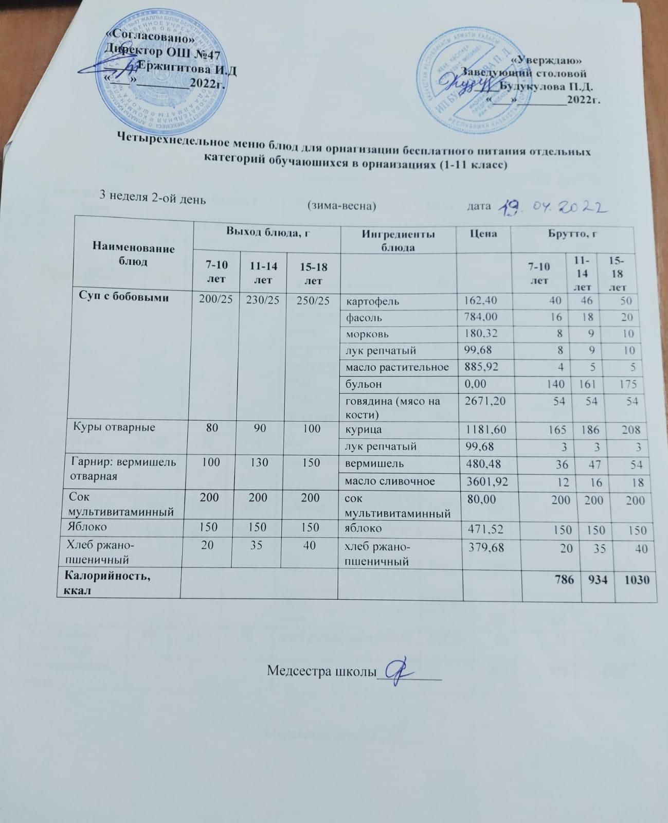 МЕНЮ (Зима- Весна) 3 неделя 2 день 19.04.2022 г.