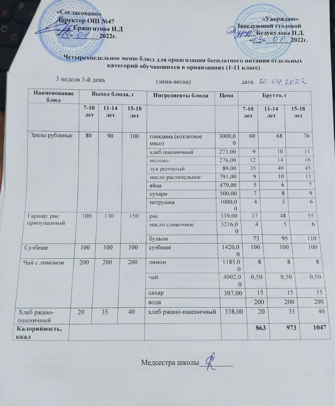 МЕНЮ (Зима- Весна) 3 неделя 3 день 20.04.2022 г.