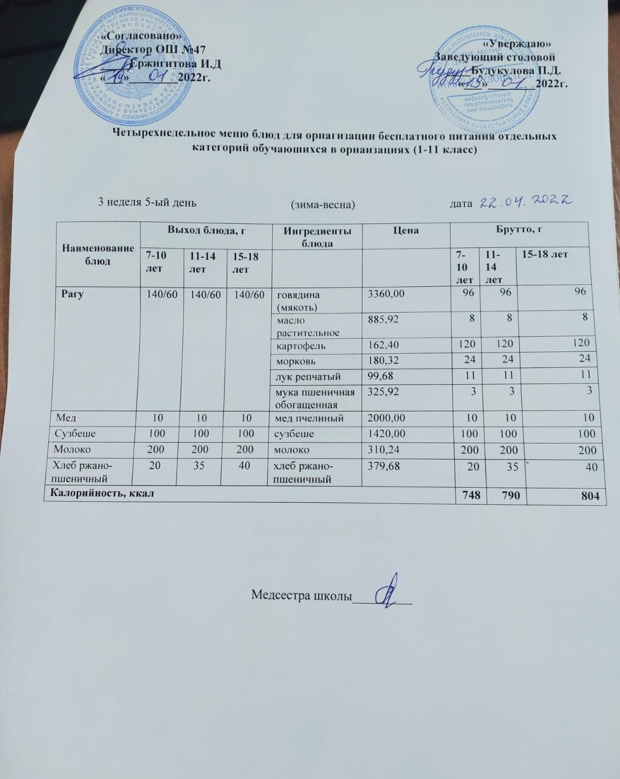 МЕНЮ (Зима- Весна) 3 неделя 5 день 22.04.2022 г.