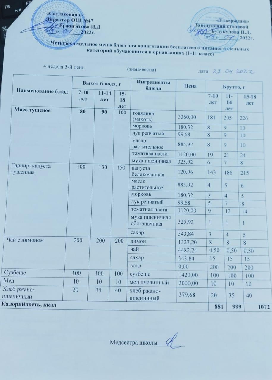 МЕНЮ (Зима- Весна) 4 неделя 3 день 27.04.2022 г.